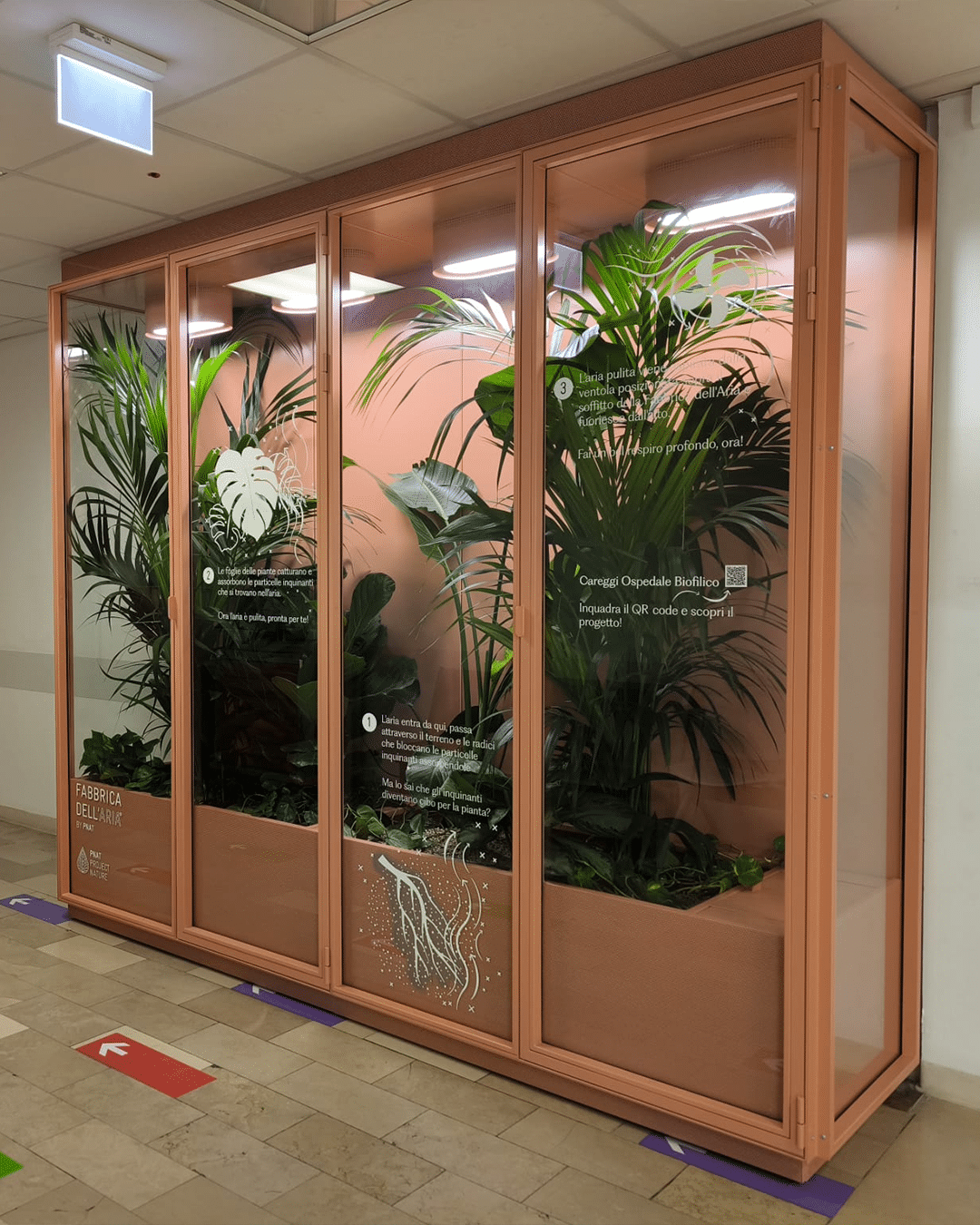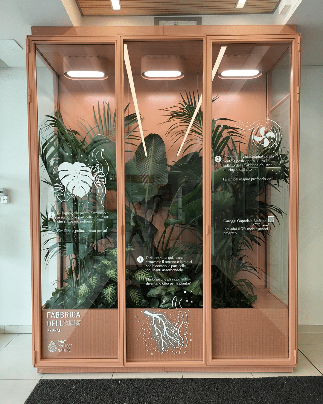 L’ospedale fiorentino di Careggi ha ora un nuovo sistema di filtraggio dell’aria, rivoluzionario e sostenibile: la fabbrica dell’aria. È una serra modulare che contiene al suo interno varie tipologie di piante ed è in grado di aspirare e filtrare l’aria, restituendola depurata e riossigenata attraverso le foglie e le radici. La bio-macchina è ideata dal neurobiologo vegetale e professore dell’Università di Firenze Stefano Mancuso e realizzata da Pnat, società fondata come spin-off dell’Università di Firenze.