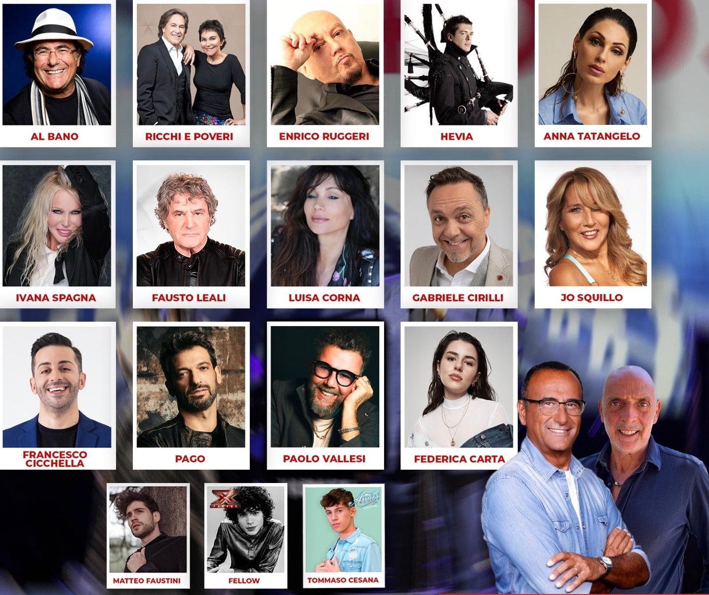 Martedì 23, dopo il grande successo dello scorso anno, alle ore 20.00 a Villa Bertelli a Forte dei Marmi torna La Canzone del Cuore, un grande spettacolo presentato da Carlo Conti e da Paolo Brosio insieme sul palco con le conduttrici Adriana Volpe, Flora Canto, Miriana Trevisan, le show girl Matilde Brandi e Cecilia Capriotti e tantissimi altri ospiti: Roberto Mancini, Albano, Enrico Ruggeri, Fausto Leali, Ivana Spagna,Jo Squillo,Luisa Corna, Pago, i Ricchi e Poveri,Anna Tatangelo, Hevia, Federica Carta, Matteo Faustini, Fellow , Tommaso Cesana , Paolo Vallesi, Francesco Cicchella, Gabriele Cirilli.