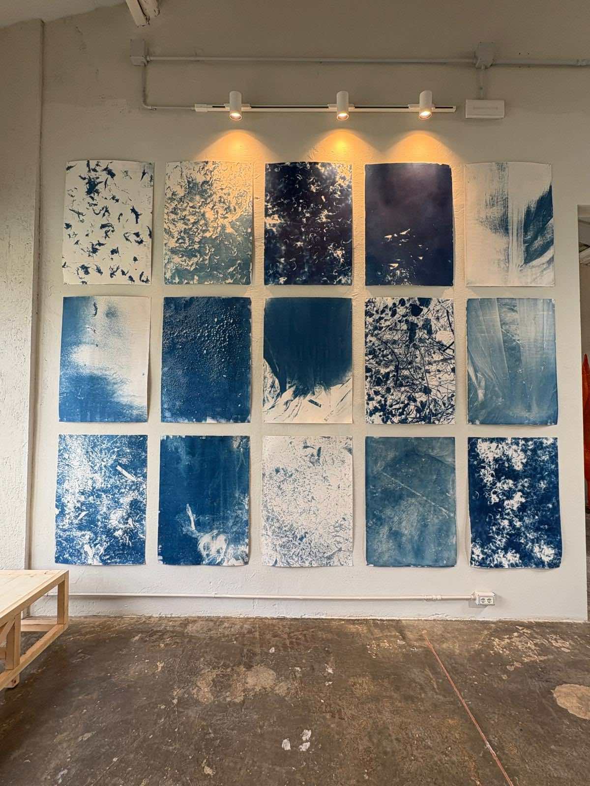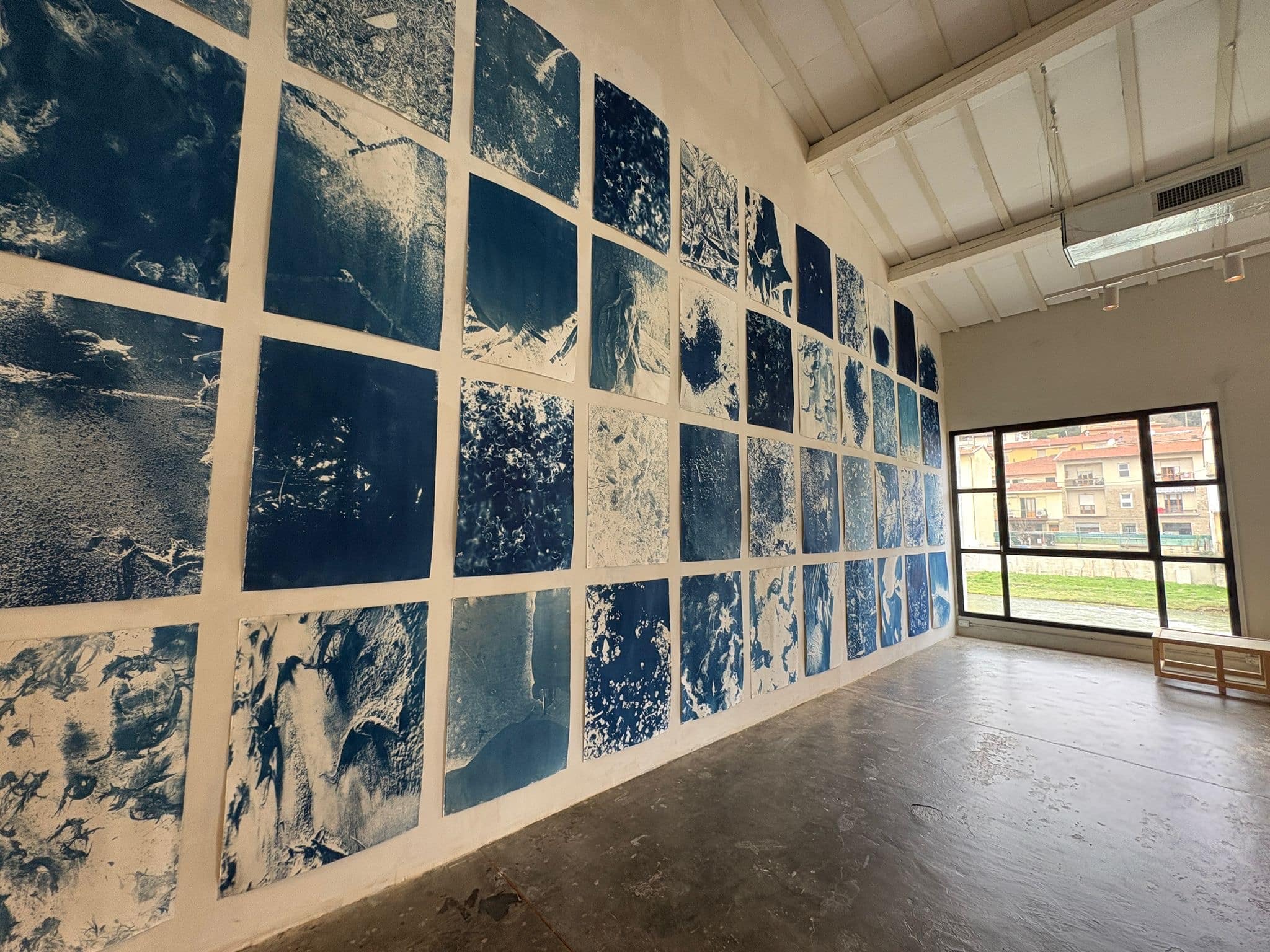 Il blu intenso della cianotipia – tecnica storicamente legata alla registrazione della luce e alle sperimentazioni ottocentesche di Anna Atkins – diventa per Pirri una riflessione su memoria, traccia e trasformazione dell’immagine.