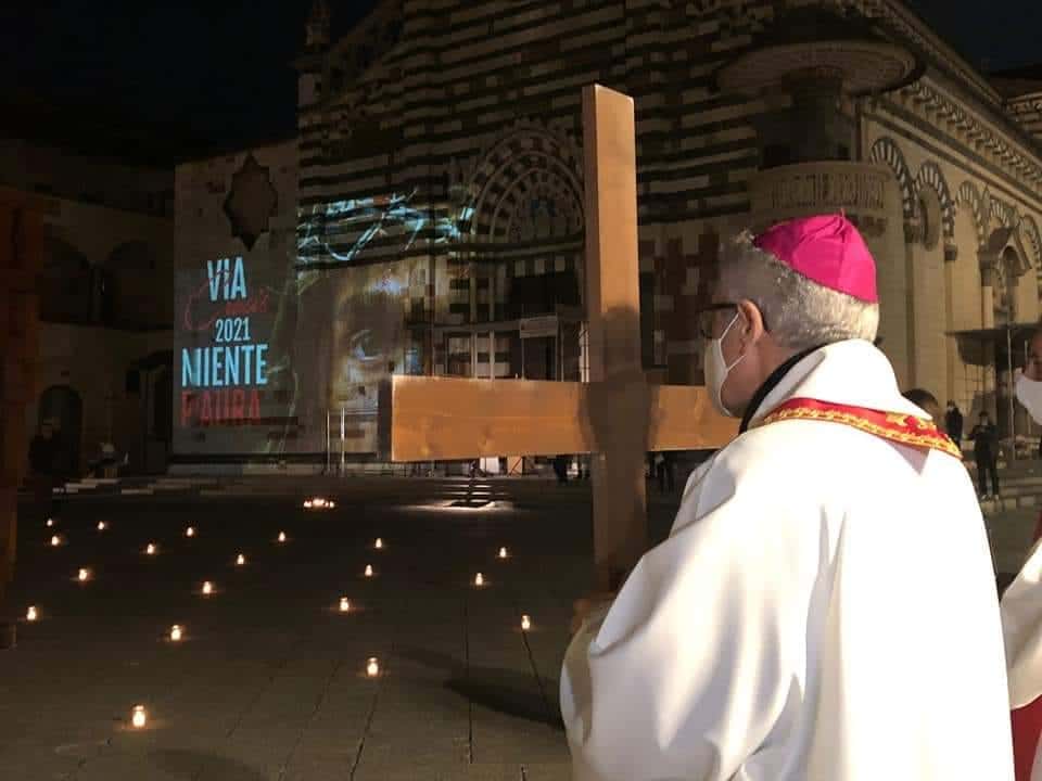 Il vescovo Nerbini ha guidato la Via Crucis lungo sette stazioni dislocate all’interno della piazza che è stata chiusa al pubblico e ad ogni fermata c’è stata una testimonianza. A parlare sono state una malata di Covid guarita dalla malattia, una mamma che ha vissuto l’esperienza del Coronavirus insieme alla sua famiglia, una infermiera impegnata in una casa di riposo, un medico, un insegnante di scuola superiore. La settima stazione, quella della Resurrezione, è stata commentata dal Vescovo.