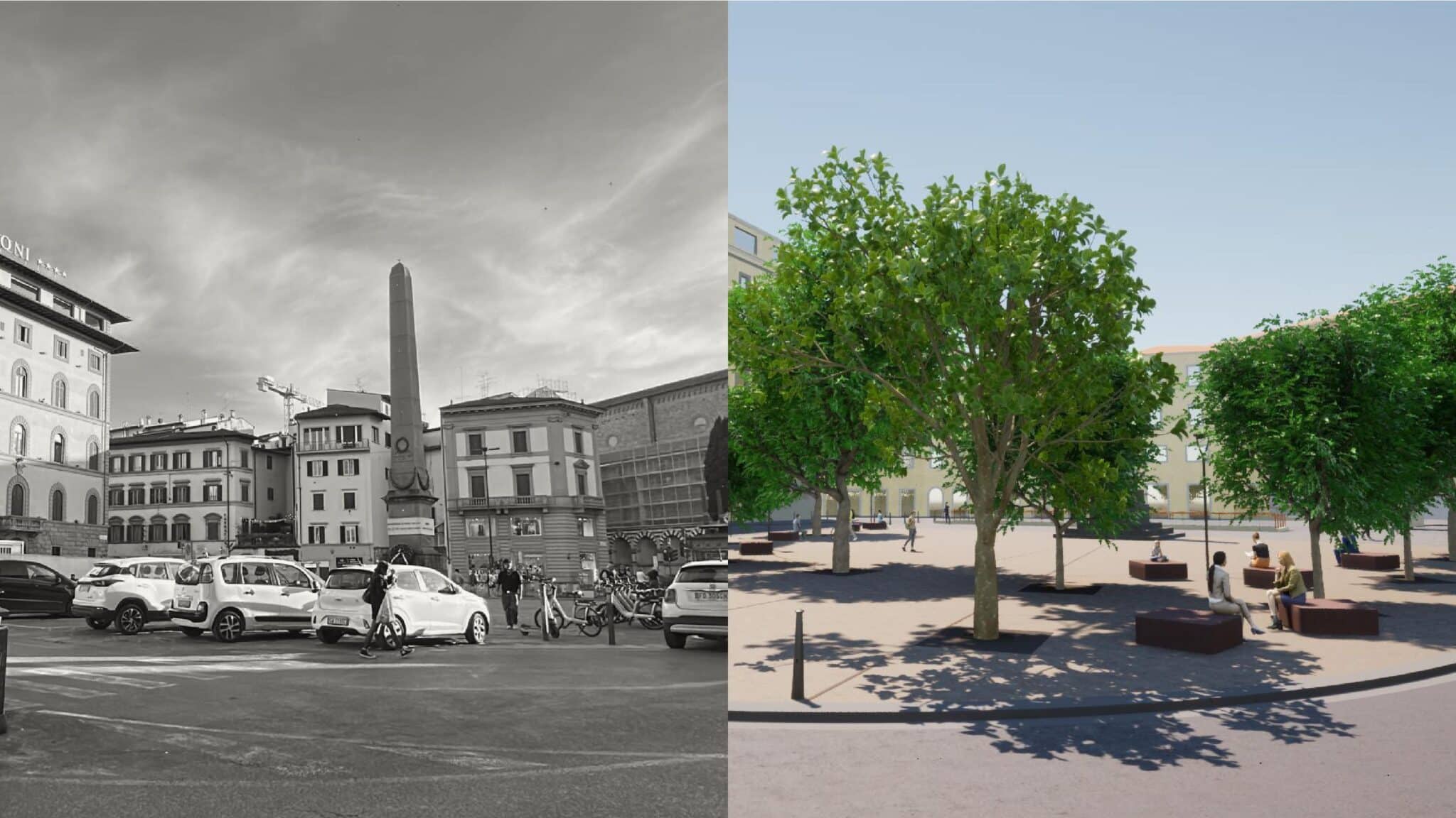 La vera novità tecnica riguarda però ciò che avremo sotto i piedi. Addio all’asfalto tradizionale: l’area centrale sarà realizzata in terra stabilizzata, un materiale naturale e drenante che permette all’acqua di infiltrarsi nel terreno, mentre le zone carrabili useranno cemento architettonico a basso assorbimento termico. Una scelta approvata dalla Soprintendenza che strizza l’occhio allo stile di piazza Santa Maria Novella, con inserti metallici a guidare il percorso verso l’obelisco.