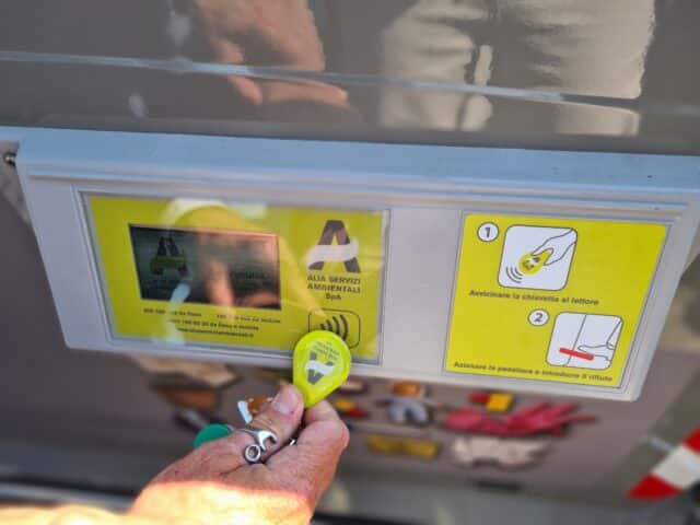 Avvicinando lo smartphone al cassonetto, con il bluetooth attivo (dopo il primo accesso), e scansionando l’apposito simbolo presente sul contenitore digitale, il cassonetto si sblocca: a questo punto, attivando la pedaliera o il coperchio è possibile aprire il contenitore ed effettuare il conferimento.