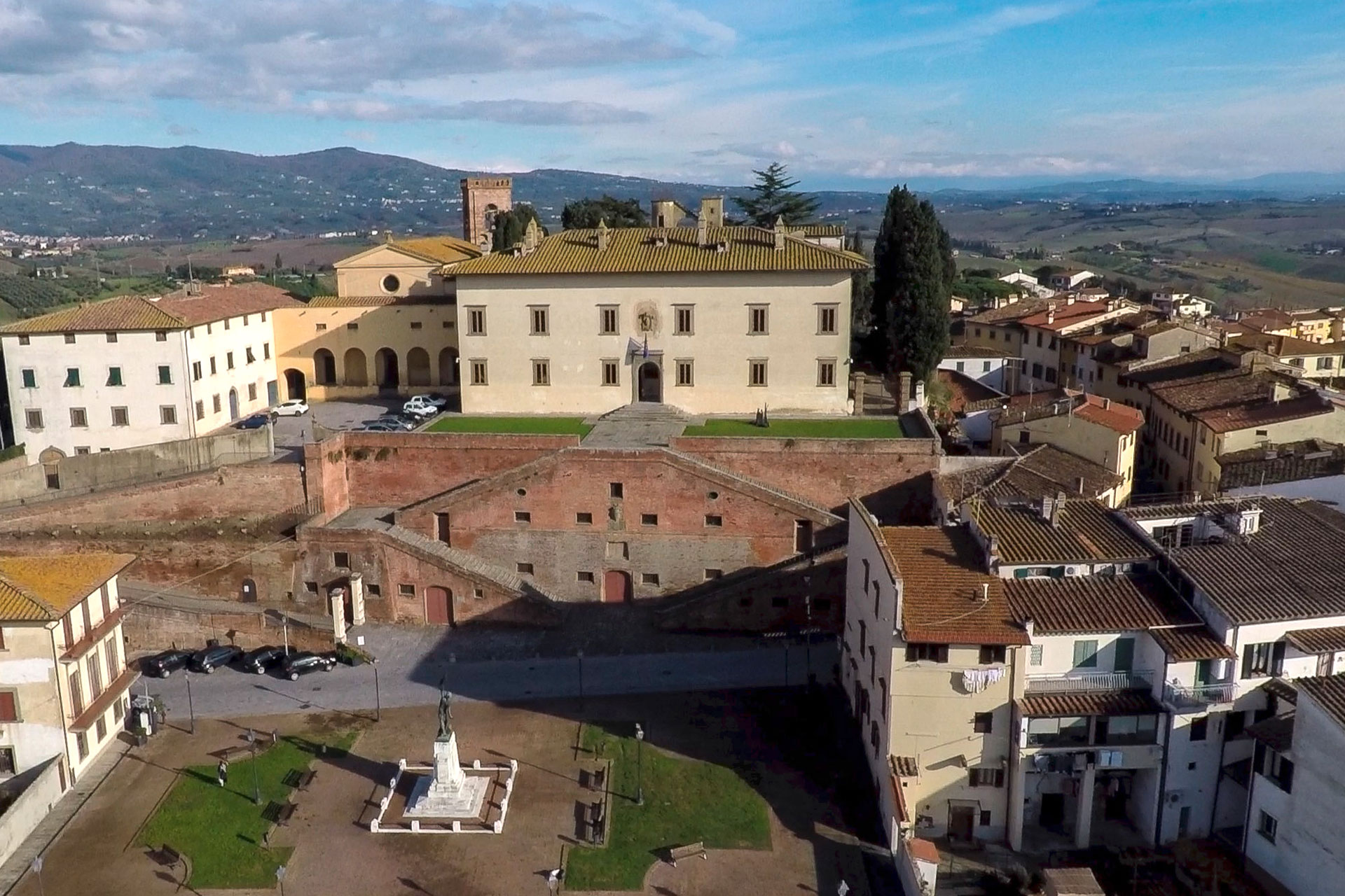 La villa medicea di Cerreto Guidi fu edificata su disposizione del duca Cosimo I de’ Medici come residenza di caccia e punto di controllo strategico sul territorio circostante, in particolare del Padule di Fucecchio. La costruzione della villa, eretta impiegando i materiali della diroccata Rocca dei conti Guidi e della seconda cerchia di mura, fu realizzata tra il 1564 ed il 1566. Diresse i lavori l’architetto Davide Fortini, già collaboratore di Tribolo, al quale dovette poi subentrare Alfonso Parigi il Vecchio. Mentre le quattro imponenti rampe d’accesso perfettamente simmetriche “a scalera”, denominate “ponti medicei”, che costituiscono la caratteristica saliente della villa furono realizzate da Bernardo Buontalenti.