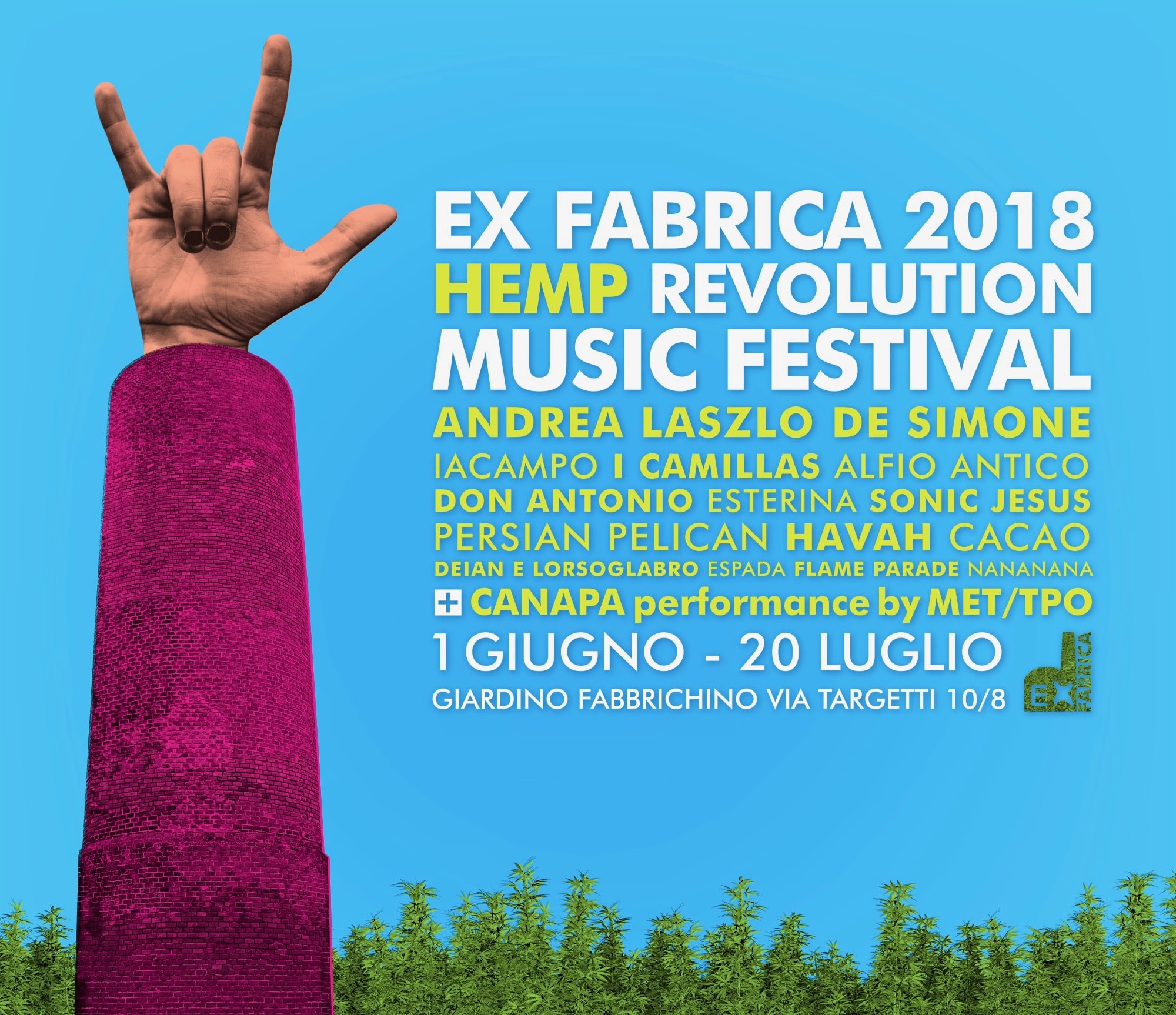 I giorni 15, 16 e 17 giugno si terrà l'Hemp Revolution Weekend, una tre giorni con ospiti, musica, proiezioni e cibo a tema: il 15 giugno, dalle 18 Aperitivo Hemp con selezione musicale a cura di Audioglobe, fino alle 21.30, orario in cui è previsto un incontro pubblico con la scrittrice-giornalista Chiara Spadaro, autrice del libro “Canapa Revolution”. Nel weekend sarà possibile degustare cibi e aperitivi a base di canapa. Inoltre la Compagnia TPO presenterà al Teatro Fabbrichino lo spettacolo dal titolo emblematico “Canapa”, produzione Teatro Metastasio di Prato.