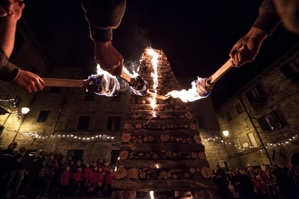 E' uno dei riti tradizionali più suggestivi del Natale quello che si tiene ogni anno ad Abbadia San Salvatore, borgo del Monte Amiata, in provincia di Siena. Qui - dal giorno dell'Immacolata - si inizieranno a predisporre le legna con cui verranno innalzate le Fiaccole, cataste a forma piramidale, che si leveranno al cielo in attesa del 24 dicembre, quando verranno incendiate.