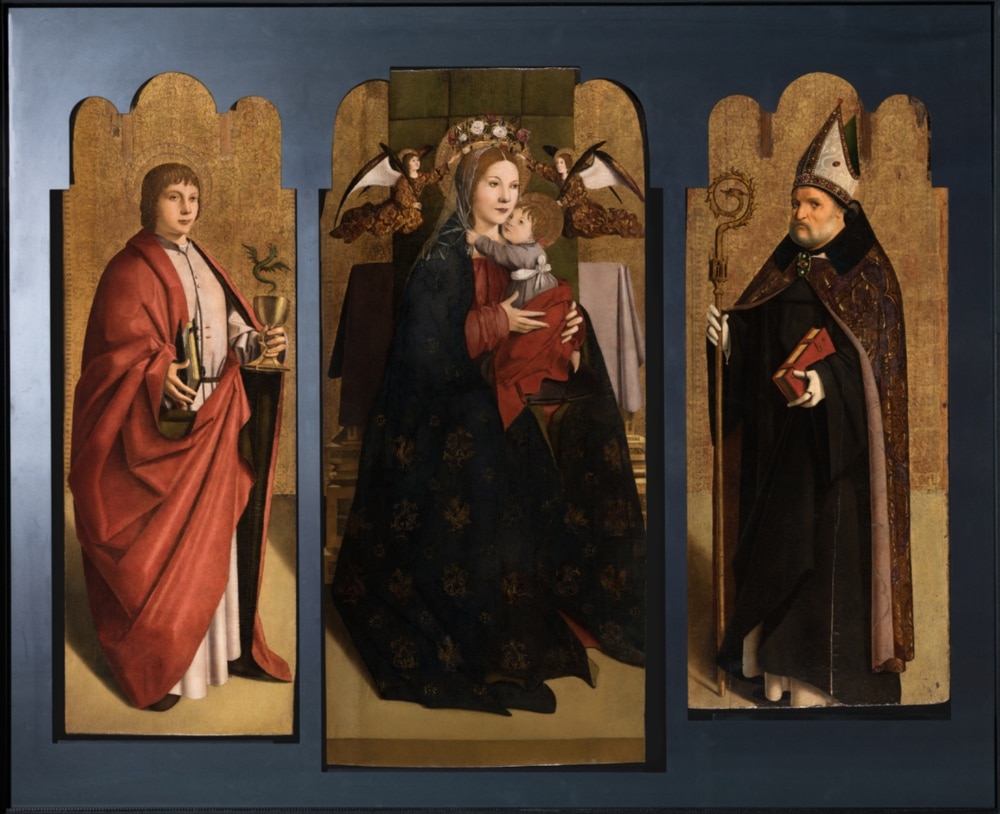 Le tre tavole, parti di una pala d’altare che comprendeva forse altri pannelli laterali e cimase, costituiscono la più importante delle acquisizioni recenti nel catalogo di Antonello da Messina, sebbene di esse si conosca, in modo piuttosto lacunoso, solo gli ultimi quarant’anni di storia. Attraverso la casa d’aste Finarte a Milano, nel 1995 il pannello con San Benedetto venne acquistato dalla Regione Lombardia ed esposto nel Museo del Castello Sforzesco, mentre gli scomparti con la Madonna in trono col Bambino e San Giovanni evangelista furono comprati dal Ministero per i beni culturali per la Galleria degli Uffizi nel 1996 tramite l’antiquario Giancarlo Gallino di Torino. I due pannelli sono pervenuti agli Uffizi nel 2002, al termine delle indagini diagnostiche e della revisione del restauro cui furono sottoposti presso l’Istituto Centrale del Restauro di Roma.