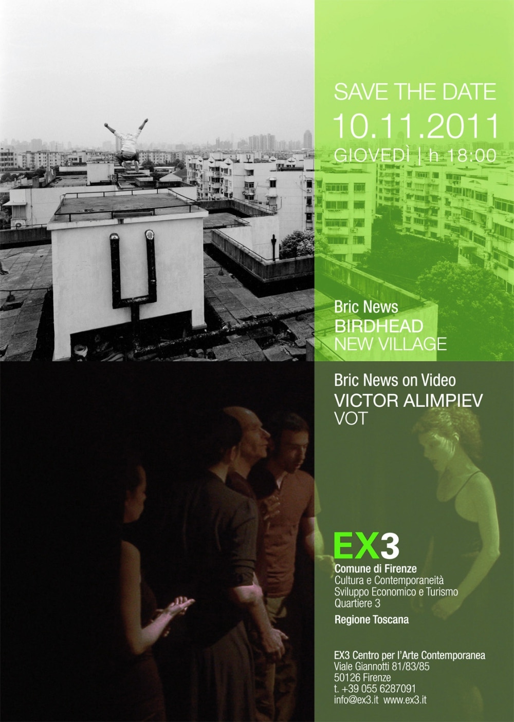 Per il ciclo Bric News. Arte contemporanea da Brasile, Russia, India e Cina, a cura di Lorenzo Giusti, il Centro per l’arte contemporanea EX3 di Firenze presenta, dal 10 novembre 2011 al 6 gennaio 2012, due nuovi eventi: una mostra personale dei fotografi cinesi Birdhead, dal titolo New Village, e la proiezione del video Vot, dell’artista russo Victor Alimpiev.