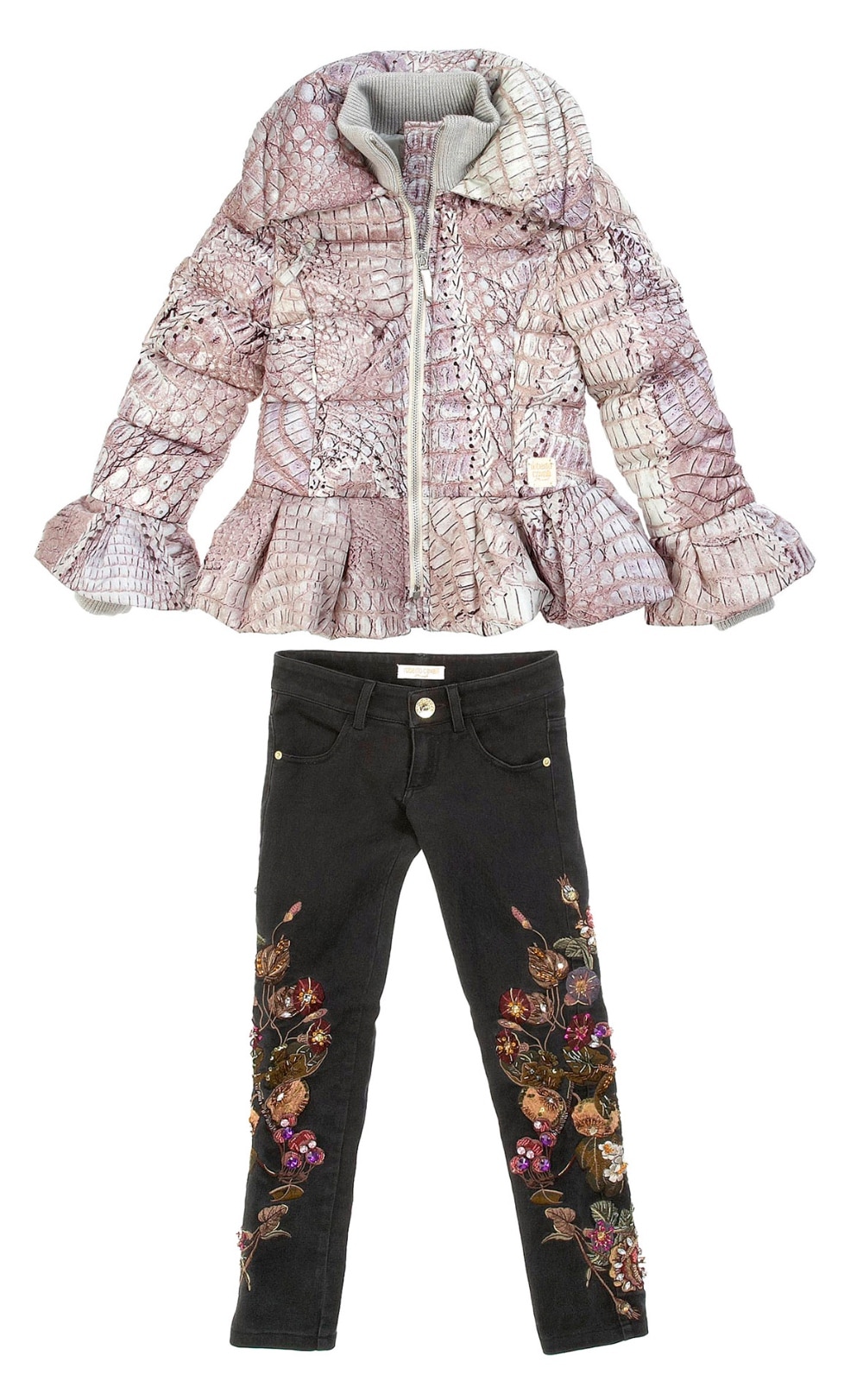 L’inedita stampa giaguaro, già icona della maison, viene per la prima volta utilizzata anche nelle collezioni dedicate alle bimbe, rievocando atmosfere sauvage senza mai perdere di vista l’eleganza. Si presenta all over sull’abito in chiffon pieghettato e su gonnelline, t-shirt e camicie. Fa capolino in maniera discreta sui profili di jeans, felpe e abiti in jersey, diventa sbarazzina sulle bordature in pelliccia del cappotto.