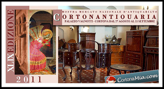 La 49° edizione di Cortonantiquaria si terrà a palazzo Vagnotti dal 27 agosto all’11 settembre 2011. Cortona, antica polis etrusca, oggi uno dei borghi più affascinanti e belli della Toscana, offre per 15 giorni la più bella passeggiata d’estate fra mobili pregiati, tappeti antichi, dipinti, sculture e oggetti da collezione cui, quest’anno, si affianca una sezione dedicata all’arte povera proposta dalla storica Galleria Tornabuoni di Firenze, quale segno di continuità con il progetto site-specific del Maestro Jannis Kounellis.