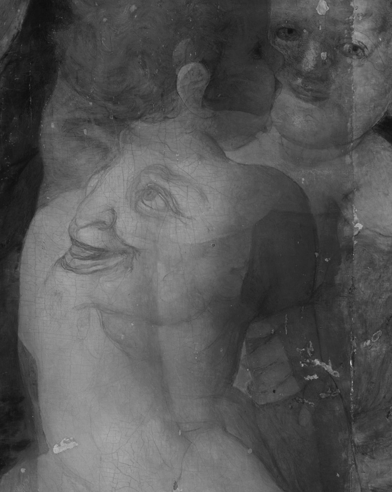 Il dipinto, descritto da Vasari e creduto perduto, è stato identificato e restituito al Bronzino da Carlo Falciani e Philippe Costamagna, ed è una delle principali aggiunte al corpus pittorico dell’artista, nella quale verranno presentate altre due opere inedite. Questa tavola era stata dipinta per Bartolomeo e Lucrezia Panciatichi, i cui ritratti sono conservati agli Uffizi, ed è un’opera chiave per comprendere la religiosità riformata della Firenze degli anni quaranta del Cinquecento. Bartolomeo e Lucrezia vennero infatti processati per eresia luterana nel 1551, e quest’opera che raffigura non una Crocifissione, ma la nicchia di un altare con un Cristo crocifisso quasi scultoreo, è testimonianza della religiosità dei committenti che, secondo gli scritti di Juan de Valdès e del Beneficio di Cristo, credevano nella giustificazione per sola fede. La riflettografia eseguita sul Cristo Panciatichi ha rivelato, secondo modi usuali nella pratica esecutiva del Bronzino, un disegno preparatorio che è stato molto variato in corso d’opera. Nel disegno il corpo di Cristo appare come schiacciato dal proprio peso, la testa è reclinata e cade all’altezza del petto mentre le braccia, ora parallele alla croce, formano un angolo più acuto e tendono verso l’alto, laddove tutto il busto è abbassato e obbliga le gambe a piegarsi verso destra. Se quel corpo fosse stato dipinto secondo il disegno sottostante l’effetto sarebbe stato essere più drammatico, e molto più simile a immagini di savonaroliana memoria dove la sofferenza del Cristo stava a monito verso i peccati commessi dagli uomini. Si sarebbe esaltata insomma la sofferenza della morte sulla croce e, di conseguenza anche le sofferenze necessarie all’uomo per la salvezza. Il dipinto avrebbe raggiunto un effetto patetico come molti crocifissi trecenteschi, oppure come nei tardi disegni di Michelangelo per un Crocifisso. Ma la salvezza offerta per la sola fede, anche nelle parole di Valdès care ai Panciatichi, non chiedeva sofferenza, ma fiducia, e lo stesso Benedetto Varchi scriveva di colui «che tutti / aspetta con le braccia aperte in su la croce eletta, / per dar salute ai buoni, a’ rei perdono. / Perdon gli chieggio umilmente, e certo / son ch’io l’avrò, ché le parole sue / mentir non ponno». Bronzino, in obbedienza a tali pensieri tralasciò il disegno eseguito, come testimonia Vasari, da un vero corpo morto confitto in croce, e rese più dolce e serena la composizione, ispirandosi sia ai pensieri valdesiani che alla statuaria di primo Quattrocento.