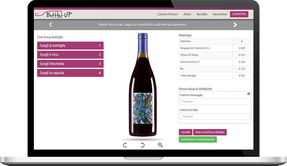 www.bottle-up.com è la prima piattaforma web che consente di creare bottiglie al 100% personalizzate in soli 5 click. I clienti possono essere sia privati sia wedding planner, aziende, ristoranti, agriturismi o catering che richiedono bottiglie di vino e birra per cene, feste e degustazioni, per eventi esclusivi e ricorrenze. Il processo è semplicissimo: è possibile scegliere la tipologia di bottiglia desiderata (borgognotta o bordolese, per esempio), il vino o la birra preferiti dei produttori partner, un’etichetta d’artista in serie limitata (o fare un upload di un proprio disegno), fino ad arrivare alla selezione del packaging dove il cliente può personalizzare la scatola confezionando le bottiglie create in totale libertà. Infine è possible anche inserire un messaggio o una dedica ed una data. "Abbiamo un'offerta dinamica, sempre in evoluzione: vini di piccoli cantine selezionate e birrifici artigianali uniti ad etichette esclusive disegnate da artisti e designer emergenti, c’è inoltre la possibilità di avere un'etichetta propria. I prezzi vanno dalle 9€ alle 14,50€ per bottiglie formato 0,75 cl, escluso il packaging (il cui costo varia in base alla capienza). Per le magnum da 1,5 lt i prezzi sono mediamente il doppio".