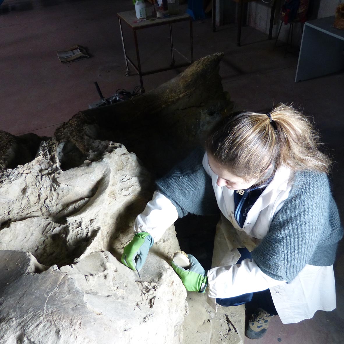 Aquiloni - con un paziente lavoro di ripulitura - sta facendo emergere la superficie ossea del cranio e l’avorio delle difese. Queste ultime, molto fragili e compromesse dalla permanenza nel terreno da almeno 1,5 milioni di anni, hanno particolarmente bisogno di essere consolidate con specifici prodotti chimici. Durante questo “scavo in laboratorio” è venuto in luce un altro osso, una scapola di cervide, che giaceva nei sedimenti dell’antico torrente che inglobavano anche il cranio di Mammuthus.
