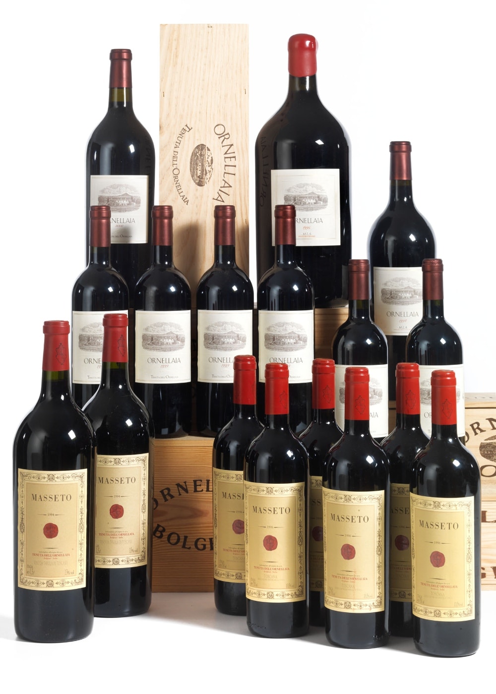 Tra i più indicativi c’è il lotto composto da una bottiglia di Solaia 1990, due bottiglie del 1987 e una del 1982 stimato 350 euro oppure il lotto di 6 bottiglie della prestigiosa annata 1997 valutato 850 euro. L’immancabile Ornellaia è presente con vari lotti di annate diverse, sia in formati standard che in formato magnum e doppio magnum. Sempre dell’azienda Tenuta dell’Ornellaia da segnalare ci sono i due lotti di Masseto magnum del 1994 stimati 475 euro ciascuno.