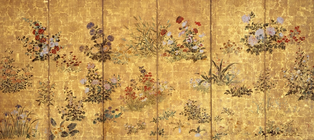 Piante fiorite delle quattro stagioni, particolare del paravento di sinistra a sei ante, sigillo Inen, colore e foglia d’oro su carta, primo periodo Edo (secolo XVII)