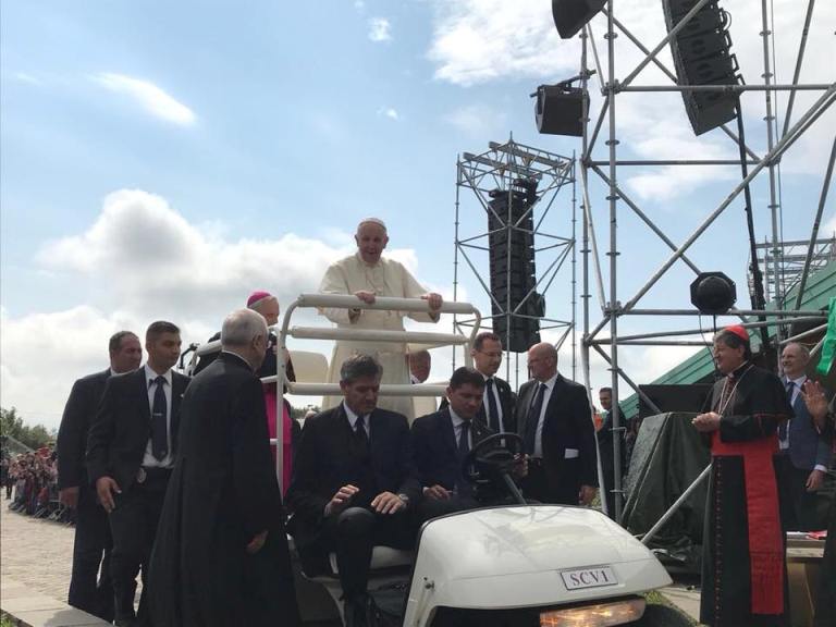 Dopo la visita a Nomadelfia l'elicottero con a bordo Papa Francesco è atterrato alla Cittadella di Loppiano (Firenze), nel campo sportivo ad attenderlo c’erano settemila persone. All'arrivo di Francesco le campane di Loppiano hanno suonato a festa. Dopo un breve tragitto in papamobile Bergoglio si è diretto al santuario Maria Theotókos, la chiesa della cittadella intitolata alla Madre di Dio e voluta dalla fondatrice dei Focolari Chiara Lubich, per una breve sosta di preghiera.