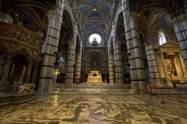 Il pavimento è una vera opera d'arte: ognuno dei 56 riquadri, chiamati “tarsie”, è stato disegnato dai maestri del Rinascimento, copiato dai marmisti e lavorato dagli scalpellini negli splendidi marmi locali, da quello grigio della Montagnola senese al prezioso broccatello giallo. Le tre navate sono dedicate agli episodi e ai personaggi della cultura umanista greca e romana che hanno profetizzato l’avvento del Salvatore, come Ermete Trismegisto, precursore dei profeti, mentre la Madonna e Cristo si rivelano solo ai piedi dell’altare e sotto la Cupola si trovano le storie dell’Antico Testamento, come la arsia dedicata al sacrificio di Isacco disegnata da Domenico Beccafumi.