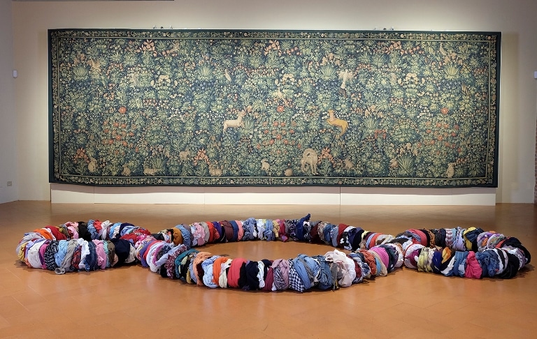 Il “Terzo Paradiso” è un'opera collettiva fatta di riuso, realizzata dalle donne della cooperativa sociale Manusa, che hanno tagliato, aggiustato e ricomposto i panni usati.