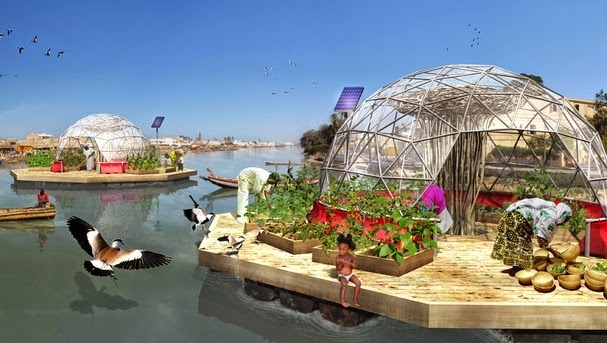 La struttura, costruita con materiali a basso costo, è composta da un basamento in legno di circa 70 mq che galleggia su fusti in plastica riciclati, sopra cui viene montata una serra in vetro per le coltivazioni. All'interno un moderno sistema di coltivazione idroponica garantisce un risparmio di acqua fino al 70% rispetto alle culture tradizionali.