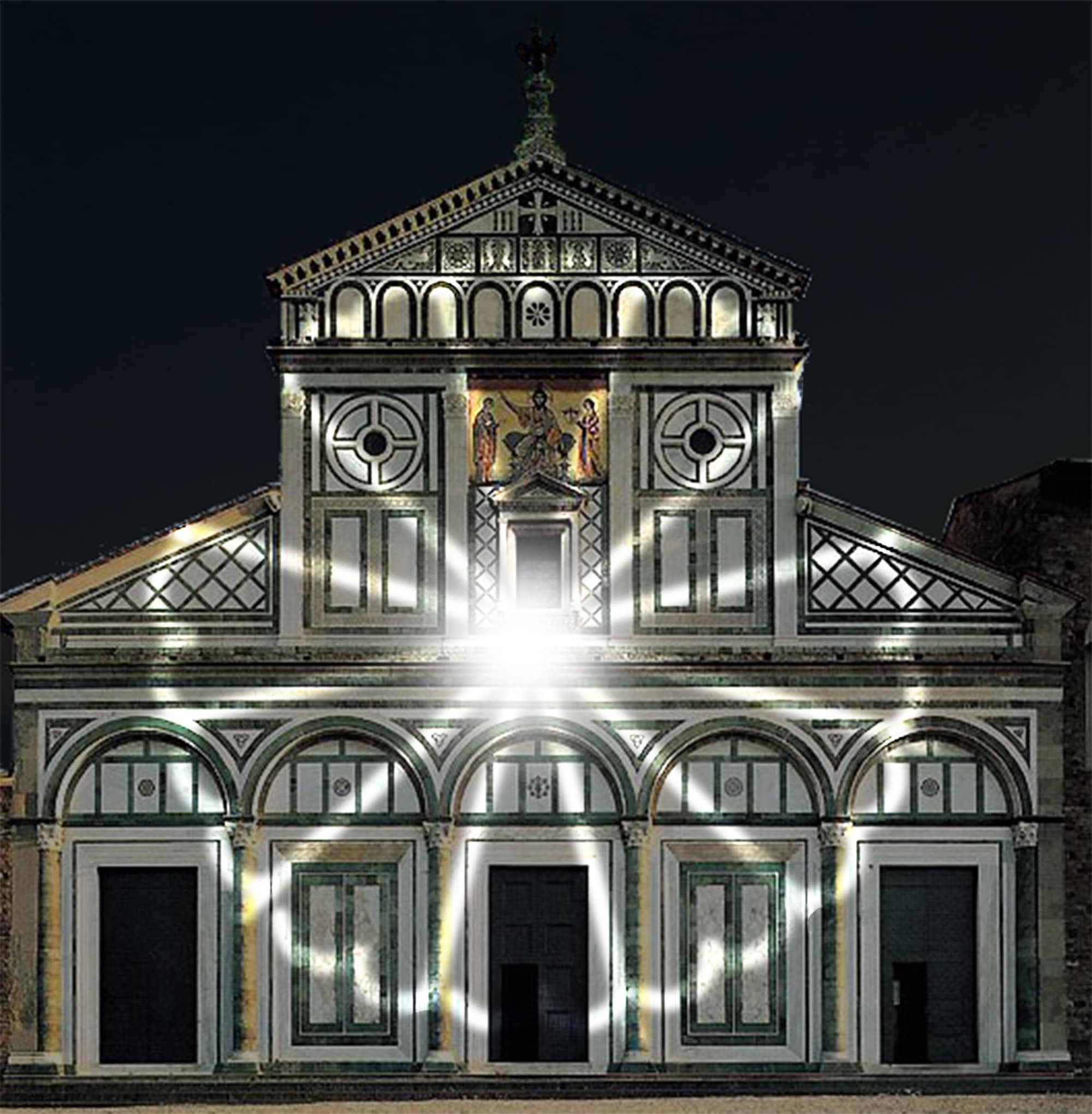 La magnifica facciata sarà un fondale dinamico, architettura di luce davanti alla quale il corpo dei performer darà vita al racconto delle forme, degli elementi, dei simboli e dei misteri, per una drammaturgia audio-visuale di forte impatto percettivo. La performance sarà un’intensa sollecitazione sensoriale che favorisce il volo percettivo, il quale attraverso la vibrazione della luce, unirà la profonda spiritualità di San Miniato al Monte alla città sottostante.