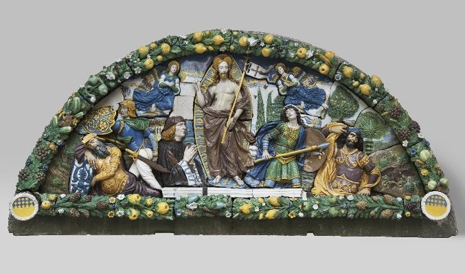 Commissionata probabilmente intorno al 1520 da Niccolò di Tommaso Antinori, che dette inizio alla fortuna imprenditoriale di questo antichissimo casato fiorentino, la lunetta è di dimensioni monumentali e resta oggi uno dei più notevoli esempi della produzione di Giovanni della Robbia. Figlio di Andrea e insieme a lui continuatore della bottega del nonno Luca, Giovanni si indirizzò verso una produzione contraddistinta da una maggiore esuberanza decorativa e cromatica, come appare proprio da questo straordinario esemplare, rimasto per quasi quattro secoli nella sua ubicazione originaria, la prestigiosa Villa Le Rose costruita fuori le mura di Firenze quale residenza di campagna e sede, già in antico, di produzione vinicola. La lunetta raffigura il Cristo risorto, con il committente Antinori in ginocchio alla sua destra e i soldati attorno al sepolcro, secondo l’iconografia tradizionale: il tutto su un articolato sfondo di paesaggio e all’interno di una fastosa cornice di frutti e fiori popolata da piccoli animali.