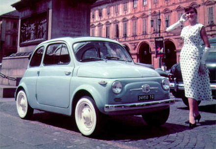 Ha scorrazzato generazioni di persone dagli anni '50 in poi, alta 1 metro e 33 cm per 1 metro e 32, lunga 2 metri e 97 cm, 479 cc di cilindarta. Col portapacchi serviva per fare piccoli traslochi mentre d'estate ed era il nuovo mezzo di un'Italia in pieno boom economico che andava per la prima volta in villeggiatura in massa verso le località marittime, status simbol di una piccola borghesia in piena ascesa. E' la mitica Fiat 500, nata evoluzione del modello precedente, la Topolino, prodotta dal 1957 dalla casa nazionale di automobili di Torino.
