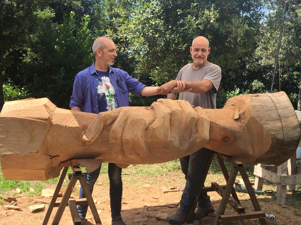 Una scultura che rappresenta l'incontro tra popoli, lungo il cammino della Via Francigena. E' quella che sta portando a compimento l'artista pietrasantese Stefano Pierotti, lavorando da settimane nel parco della Villa Reale di Marlia, modellando con scalpello e motosega il tronco di un platano abbattuto dalla straordinaria tempesta di vento che nel 2015 mise in ginocchio Versilia e Lucchesia.