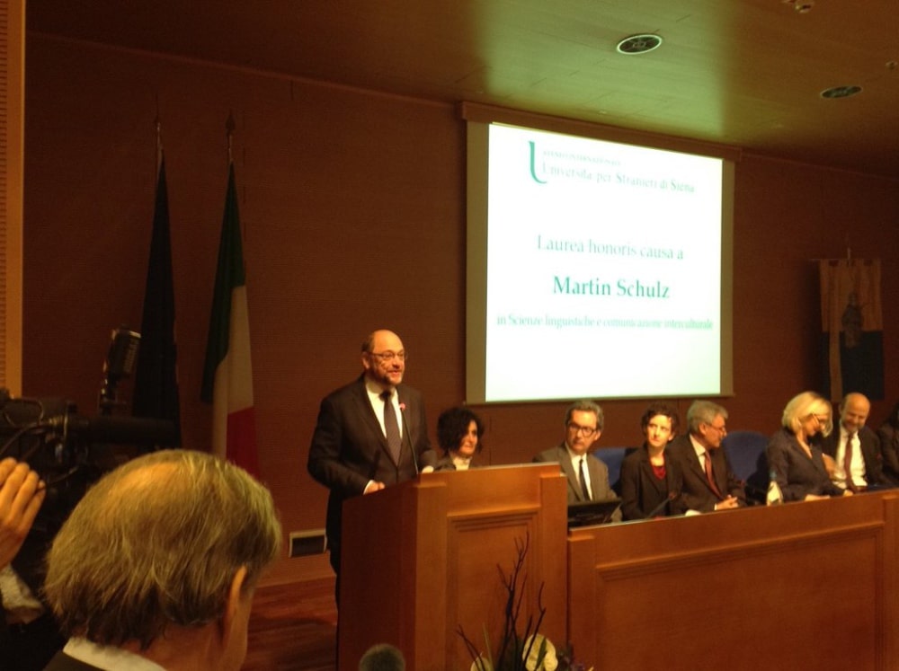 L'Università per Stranieri di Siena ha conferito la laurea honoris causa in Scienze linguistiche e comunicazione internazionali a Martin Schulz, presidente del Parlamento Europeo. L'iniziativa intende “valorizzare il percorso esemplare di un grande uomo politico europeo - si legge nelle motivazioni - che in anni difficili per l'europeismo inteso come modello culturale e non solo finanziario, ne ha strenuamente difeso i caratteri di civiltà". La consegna della Laurea è avvenuta nell'Aula Magna dell'Ateneo toscano dalle mani del Rettore Pietro Cataldi. “Il suo percorso umano e politico – ha dichiarato il Rettore - ci incoraggia a credere al valore strategico della cultura e al suo potenziale unificante, nel rispetto delle complesse articolazioni storiche e delle specificità linguistiche e nazionali, la cultura può ancora adempiere a una qualche funzione universalizzante, cioè alla costruzione e tutela di un universale umano”.