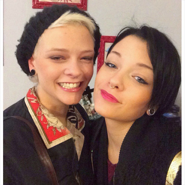 'Black & white stones' è il tema che hanno indossato Le Donatella durante le interviste, per una nella versione abito-felpa con spacco sul fianco e per l'altra con la stampa su giacca biker tecnica e t-shirt anni Novanta con taschino.