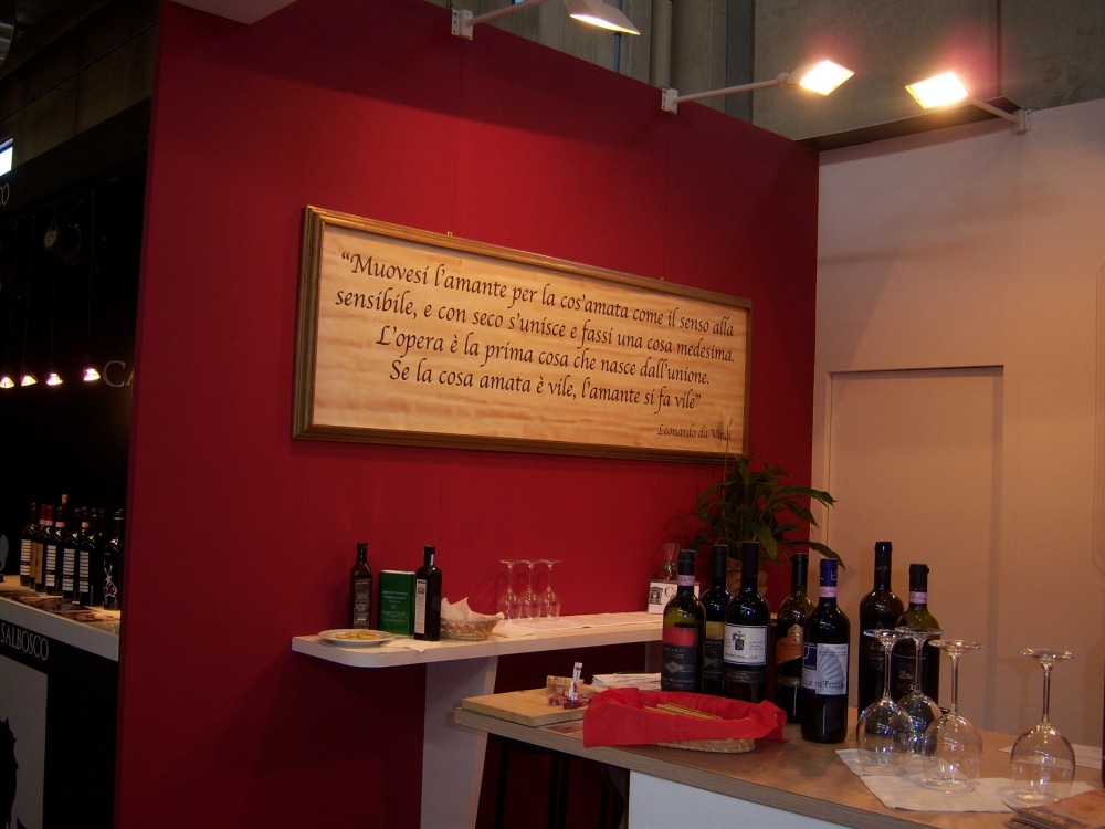 Tra le curiosità, la riproduzione sui pannelli dello stand di un passo scritto da Leonardo da Vinci: “Muovesi l’amante per la cos’amata come il senso alla sensibile, e con seco s’unisce e fassi una cosa medesima. L’opera è la prima cosa che nasce dall’unione. Se la cosa amata è vile, l’amante si fa vile".