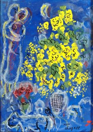 Una particolare attenzione è rivolta all’amore che sboccia e si manifesta in un tenero abbraccio al contatto di un trionfo floreale ( "Le bouquet jaune" del 1975 circa ) o in una romantica cavalcata celeste alla conquista del sole ( "Dans le ciel de Saint-Paul" del 1980 circa ). E non poteva mancare il circo in questa disamina della poetica chagalliana dove la realtà e la fantasia convivono insieme alla grazia dei movimenti e al ruolo della maschera che preserva l’innocenza.