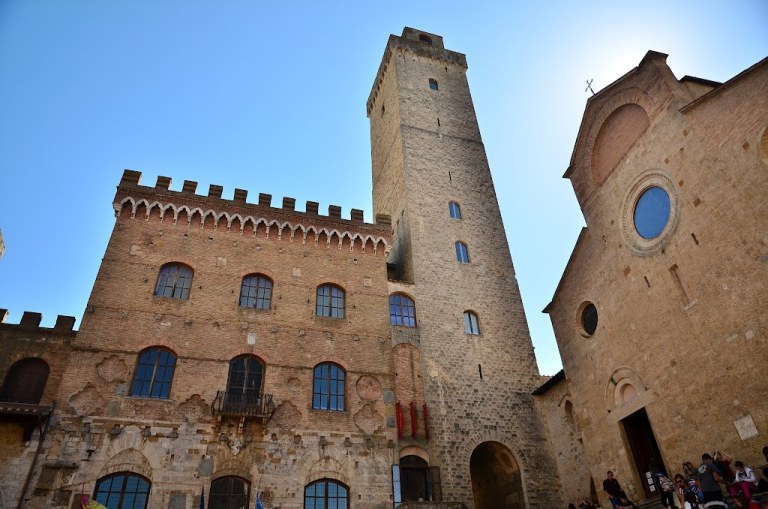 Per arrivare in cima alla Torre Grossa, la torre più alta di San Gimignano, si devono percorrere duecentodiciotto scalini, arrivati in cima lo sguardo si apre a 360° ed è possibile ammirare il panorama della città con i palazzi, i tetti, le piazze e i vicoli, il rosso del cotto e il grigio del travertino, ma anche la mole boscosa del “Poggio del Comune” fino alle bianche vette delle Alpi Apuane nonché i colorati vigneti del Chianti e i dolci rilievi del Casentino e del Pratomagno.