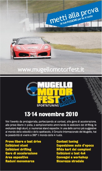 Due giorni dedicati ad un attività sia dinamica che statica con numerose attività sia in pista che nel paddock. Dopo il successo della prima edizione del Mugello Motor Fest, che ha visto come protagonista il mondo delle due ruote in tutte le sue specialità, nei giorni 13 e 14 novembre sarà la volta di questa nuova edizione dedicata all’universo automobilistico.