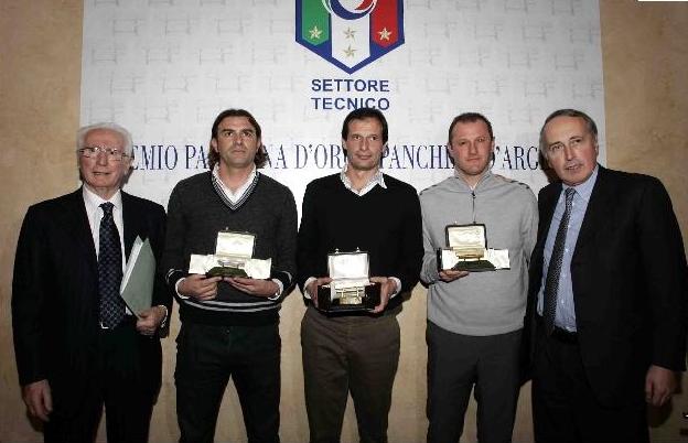 Panchina d’oro per la serie A all’allenatore del Cagliari Massimiliano Allegri; Panchina d’argento per la serie B ad Antonio Conte che lo scorso anno ha portato il Bari in A; per la Lega Pro Panchina d’oro a Claudio Bisoli (Cesena, Prima Divisione) e Panchina d’argento a Leonardo Semplici (Figline, Seconda Divisione). Sono questi i premi assegnati ieri al Centro Tecnico di Coverciano - al termine della votazione da parte di un nutrito gruppo di tecnici intervenuti alla manifestazione - agli allenatori della Lega Nazionale Professionisti e della Lega Pro che si sono distinti nella stagione 2008/2009. Alla cerimonia, presieduta dal presidente della Federcalcio Giancarlo Abete e dal presidente del Settore Tecnico Azeglio Vicini, sono intervenuti i massimi esponenti degli organi federali: Demetrio Albertini (vice presidente FIGC), Mario Macalli (presidente Lega Pro e vicepresidente FIGC), Marcello Nicchi (presidente AIA), Renzo Ulivieri (presidente AIAC) e Sergio Campana (presidente AIC).