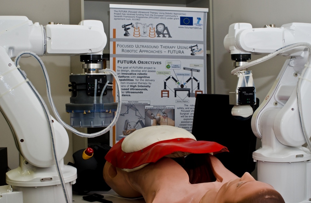 Futura svilupperà un robot altamente flessibile per trattare i tumori addominali attraverso gli ultrasuoni, sotto guida ecografica, garantendo un’invasività minima per il paziente e una maggiore sicurezza. La flessibilità e la guida robotica permettono di indirizzare il fascio terapeutico degli ultrasuoni anche su organi interni mobili, altrimenti non raggiungibili con le tecnologie utilizzate ad oggi. Grazie alla focalizzazione e alla alta potenza degli ultrasuoni, la piattaforma robotica provoca la necrosi del tessuto tumorale, ovvero causa la morte delle cellule che lo compongono. In questo modo la lesione tumorale può essere trattata senza provocare danni collaterali ai tessuti sani, senza inserire aghi o bisturi e senza ricorrere alle tradizionali incisioni chirurgiche.