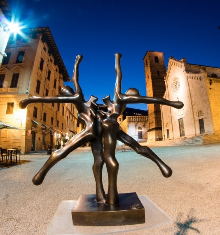 Nella centrale Piazzetta San Martino troveranno spazio cinque sculture monumentali in bronzo, realizzate tra il 1968 e il 1990, dal titolo Titano (1), Titano (2), Amore e Universo, Balletto multiplo e Icaro. All'interno del Campanile di Sant'Agostino sarà collocata un'altra imponente scultura, ma in ferro, intitolata "Uomo" e realizzata nel 1962 con la tecnica detta "della goccia su goccia". All'interno della Galleria Enrico Paoli saranno infine visibili i bozzetti in bronzo di ben 25 opere realizzate dall'artista tra il 1959 e il 1989, oltre a tre dipinti a tempera - dal titolo Balletto, Coppia e La Creazione - realizzati nel 2000 e 2001.