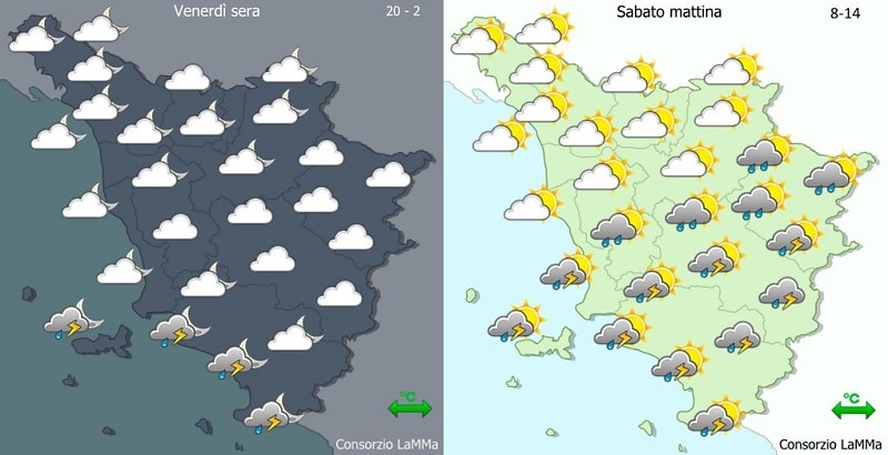 Sulla Maremma sono possibili forti temporali persistenti dalla sera di benerdì 4 per poi estendersi anche al senese e aretino durante la mattina del 5. In seguito sono ancora possibili fenomeni di forte intensità, ma più brevi e isolati, più probabili sulle zone di nord-ovest. Si segnala anche forte vento da ovest e mare molto mosso in aumento a localmente agitato sulla costa centrale.