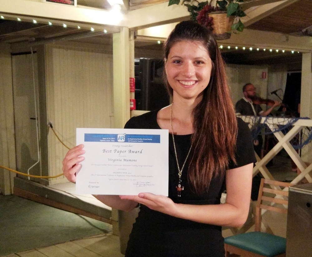 Mamone, borsista di ricerca presso il Centro EndoCAS per la Chirurgia Assistita dal Calcolatore dell’Università di Pisa, ha redatto il miglior articolo scientifico nella categoria giovani ricercatori. Articolo che deriva proprio dalla tesi con la quale si è laureta nei mesi scorsi in ingegneria. Intitolato “Robust Laparoscopic Instruments Tracking Using Colored Strips”, lo studio permette in modo semplice, accurato e ed efficace di tracciare il movimento degli strumenti chirurgici laparoscopici in un ambiente simulato con realtà aumentata.