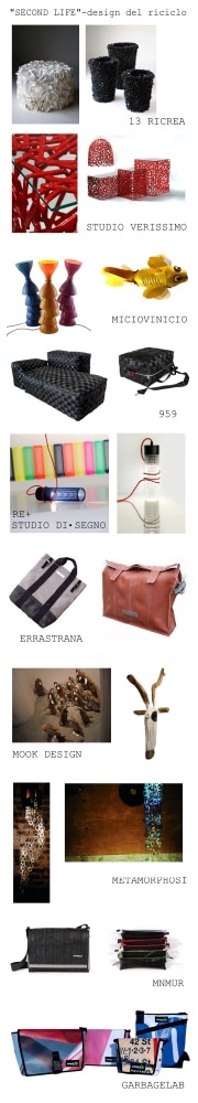 Ancora una volta lo studio livornese 70m2 ospita una collettiva di giovani designers che hanno fatto del riciclo la loro filosofia secondo cui creare nuovi ed originali oggetti d’uso prodotti industrialmente o artigianalmente. Fantasia, sostenibilità ed ecologia costituiscono il comun denominatore delle creazioni di 959, il marchio del designer Paolo Ferrari che si è distinto per il riuso delle cinture di sicurezza nella realizzazione di borse; non solo cinture di sicurezza invece per il marchio mnmur, che utilizza anche camere d’aria, teloni pubblicitari e vecchie tele di ombrelli per la fabbricazione di accessori, e il marchio Garbagelab che produce borse con striscioni pubblicitari in pvc riciclati; ed alcuni prodotti dell’associazione di promozione sociale Errastrana. Nel campo dell’arredamento invece troveremo i marchi 13ricrea, un team di tre attente designers piemontesi, che riconsidera in modo nuovo il concetto di risorsa per creare una linea colorata ed ironica di arredi outdoor; gli originali complementi di Studio Verissimo; i simpatici e coloratissimi animaletti Miciovinicio di Silvia Bragagnolo; Metamorphosi, di Ilaria Sadun, specializzato nel design riciclato di ambienti esterni ed interni; Re+ un nuovo progetto di luce e un marchio nato dalla collaborazione di Silvia Magrini e lo studio Di-Segno di Stefano Giovacchini. Infine Mookdesign un progetto nato dalla mente di due designers romani, Carlo Nannetti e Francesca Crisafulli, che utilizzano materiali di riciclo per realizzare sculture e oggetti d’uso ricchi di rimandi alla dimensione del gioco con la volontà di instaurare un rapporto emotivo con lo spettatore.