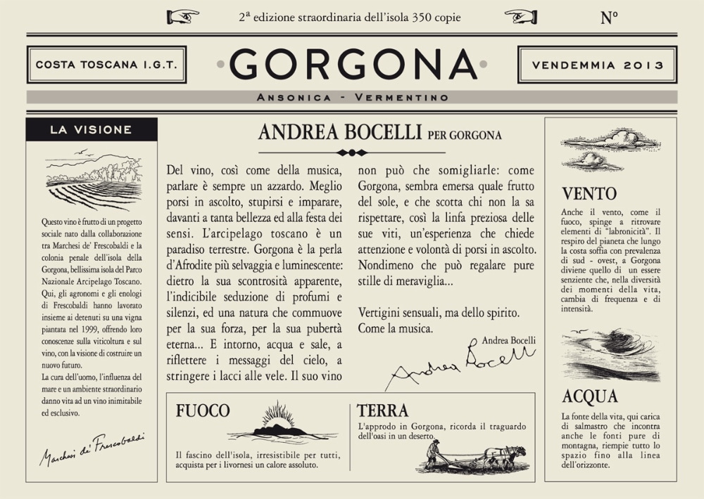 “L’arcipelago toscano è un paradiso terrestre. Gorgona è la perla d’Afrodite più selvaggia e luminescente: dietro la sua scontrosità apparente, l’indicibile seduzione di profumi e silenzi , ed una natura che commuove per la sua forza , per la sua pubertà eterna… E intorno, acqua e sale a riflettere i messaggi del cielo, a stringere i lacci alle vele. Il suo vino non può che somigliarle: come Gorgona, sembra emersa quale frutto del Sole, e che scotta chi non la sa rispettare , così la linfa preziosa delle sue viti, un’esperienza che chiede attenzione e volontà di porsi in ascolto. Nondimeno che può regalare pure stille e meraviglia…” così decanta Bocelli l’eccellenza del Gorgona.