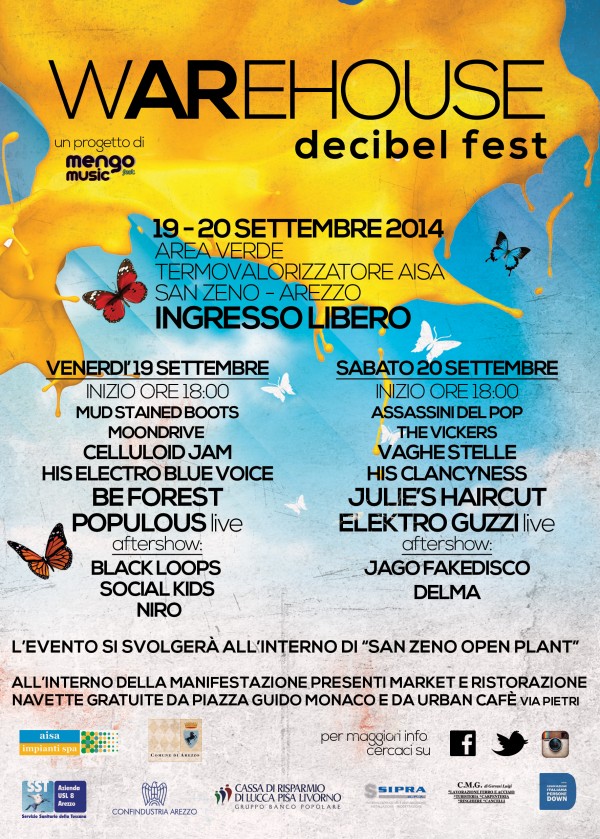 Venerdì 19 e Sabato 20 settembre nell'area verde di San Zeno, nell'ambito del San Zeno Open Plant, ariva la prima edizione del Warehouse Decibel Fest. Una nuova sfida, sempre all'insegna della grande qualità. Due giorni di concerti con ingresso gratuito, a partire dalle 18, con il patrocinio di Comune di Arezzo e il contributo di Aisa Impianti, Asl8 Toscana, Confindustria Arezzo, Cassa di Risparmio di Pisa, Lucca e Livorno, Sipra, C.M.G. e Associazione Italiana Persone Down.