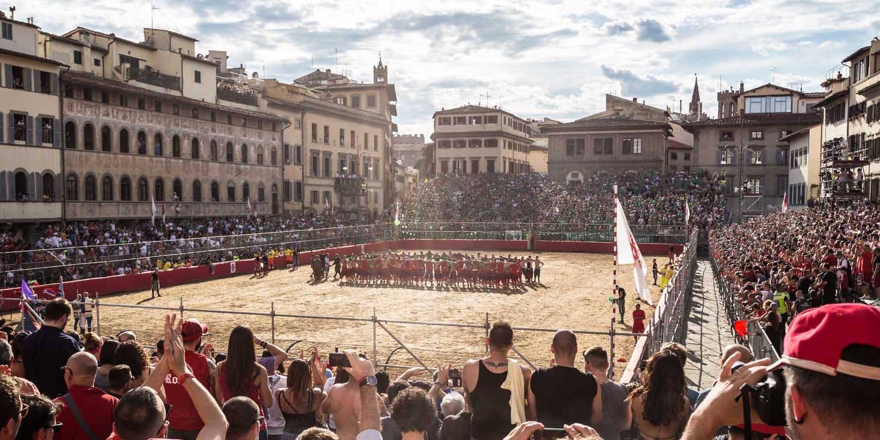 Conosciuto anche come calcio in livrea o calcio in costume, il termine di “Calcio storico” si riferisce a un antico sport, un gioco tra squadre che si effettua con un pallone. L’iniziativa si tiene nel mese di giugno in occasione degli annuali festeggiamenti del santo patrono, Giovanni Battista, in piazza Santa Croce, con la gara finale il 24 giugno, giorno della festa.