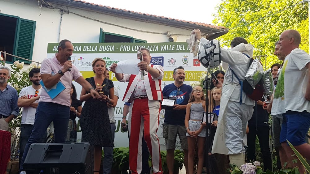 È Dario Cecchini, il macellaio poeta di Panzano in Chianti, il più bugiardo d’Italia. A Le Piastre (Pistoia) Ha dimostrato, reperti lunari alla mano, che il primo uomo a mettere piede sul satellite è stato un toscano, tale Lorenzo Chini, che ha portato con sé sul palco vestito da improbabile astronauta. La prova della conquista toscana della luna? Due bottigle di Chianti vuote e una sciarpa della Fiorentina rivenute tra i crateri lunari.