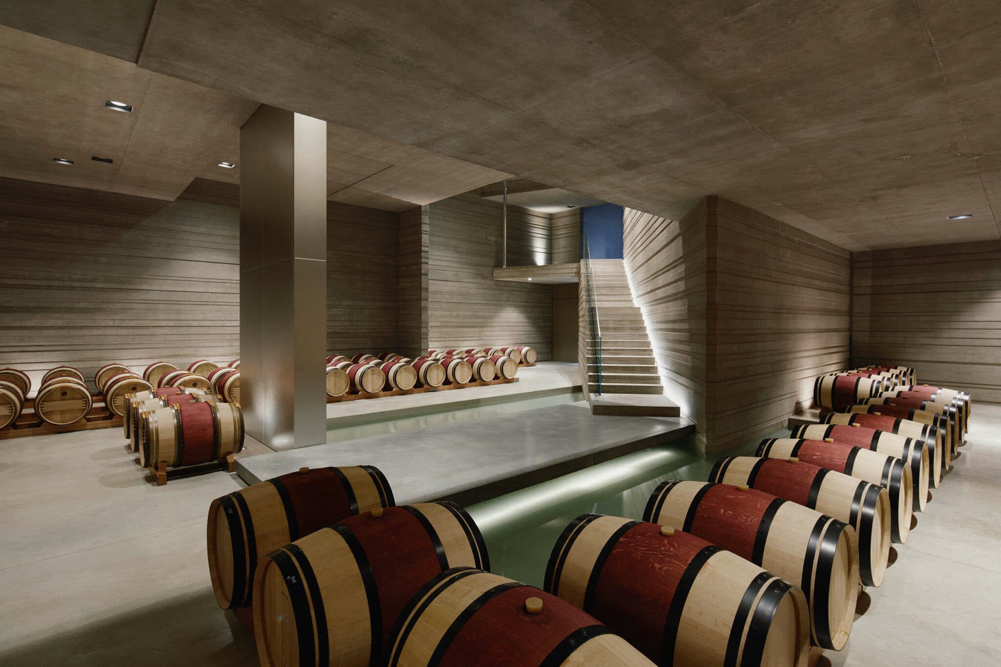 Le vaste superfici ruvide e intagliate sono il simbolo del processo estrattivo da cui è nata l’opera, mentre le aperture nelle pareti lasciano intravedere i profili verticali dell’inconfondibile argilla blu che contraddistingue il suolo di questo vigneto. Nel cuore della struttura, ovvero nel Masseto caveau, riposano i vini della tenuta. Qui, in condizioni perfette, sono conservate bottiglie di ogni annata dal 1986, ciascuna sorretta dalla propria ‘culla sospesa’ in rete in acciaio inox.