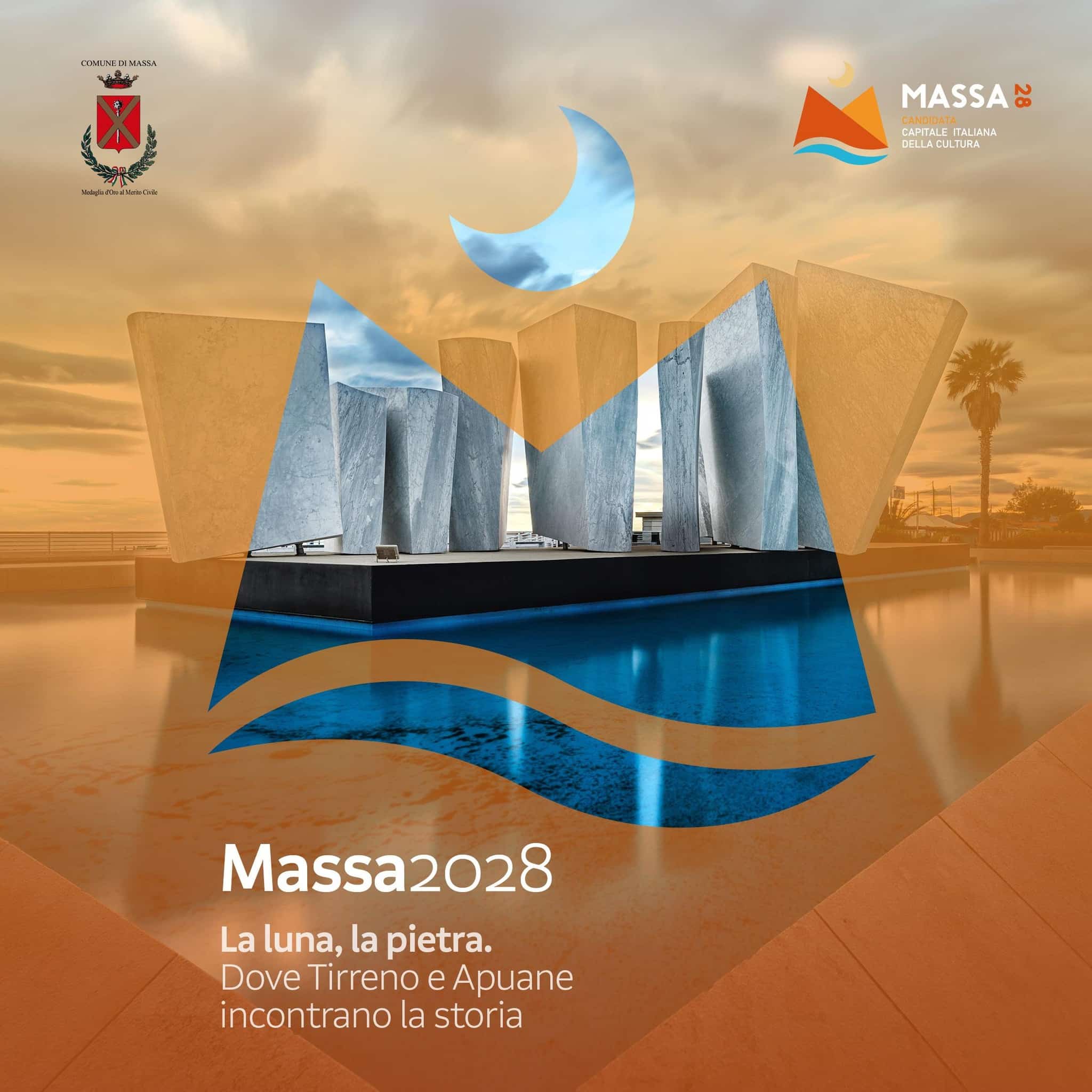 Massa si racconta attraverso due simboli forti: la pietra, che nei secoli ha plasmato pievi, castelli, borghi fortificati e le celebri cave apuane, e la luna, segno di creatività, immaginazione, movimento e fertilità. Radici solide e sguardo alto verso il futuro: è questo il cuore del progetto, che si fonda sulla geografia e sulla storia di un territorio sospeso tra mare e montagne, crocevia di civiltà e punto d’incontro tra Massa, Montignoso, Carrara, la Lunigiana e Luni.