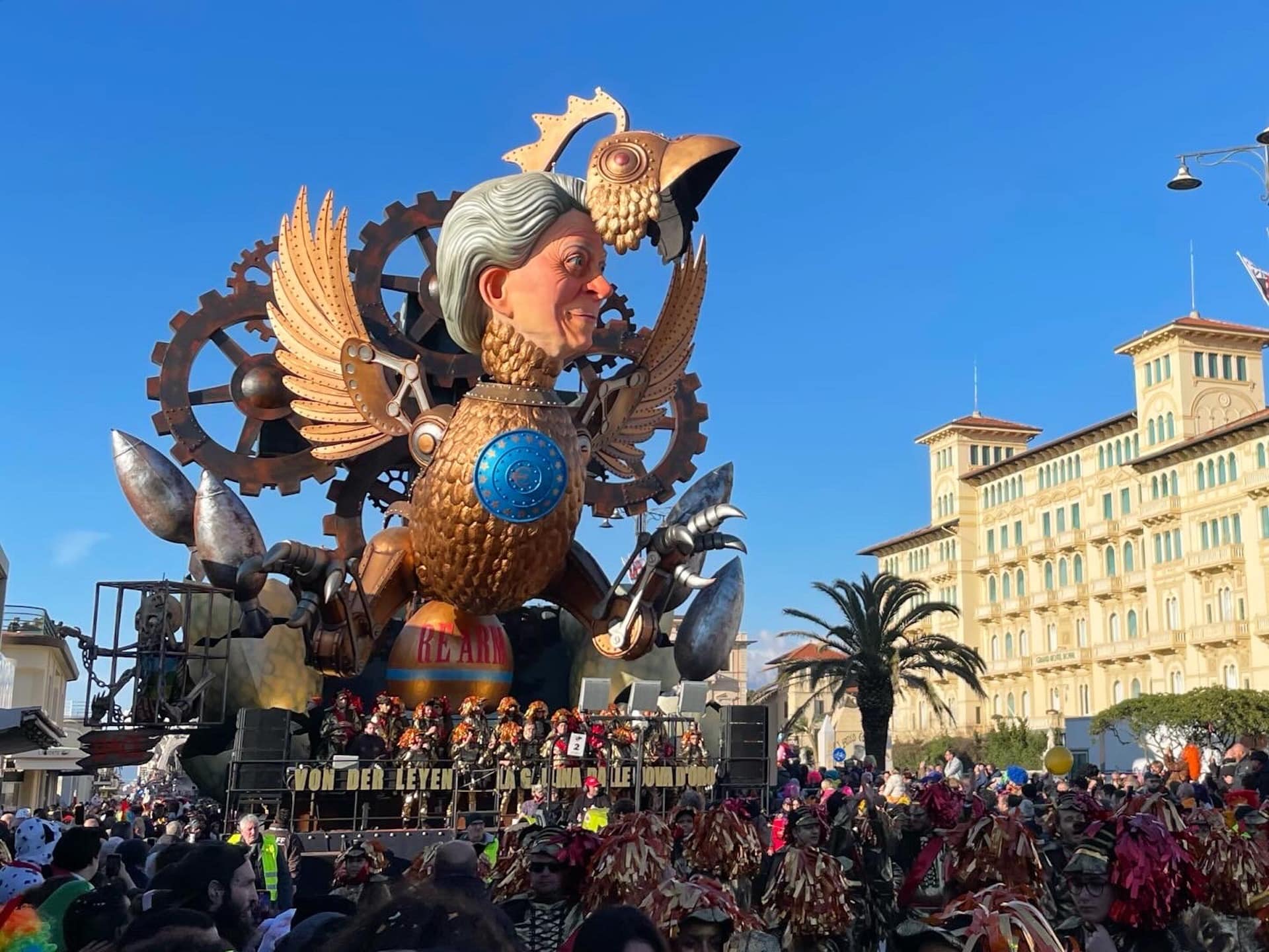 Come Ursula von der Leyen, presidente della Commissione europea, al centro del carro “La gallina dalle uova d’oro” di Alessandro Avanzini, che denuncia la militarizzazione dell’Europa, mentre ne “I samurai del potere” di Luigi Bonetti sono Trump, Putin e Xi Jinping che giocano una partita simbolica per il dominio sul mondo. I potenti della Terra tornano anche al tavolo della roulette capitanata dal Diavolo in “Gran Casino” di Lebigre e Roger, mentre Massimo e Alessandro Breschi in “The Last Hop(e)” denunciano il negazionismo climatico, davanti ad un affresco di Monet che svanisce sotto il fango dell’inquinamento.