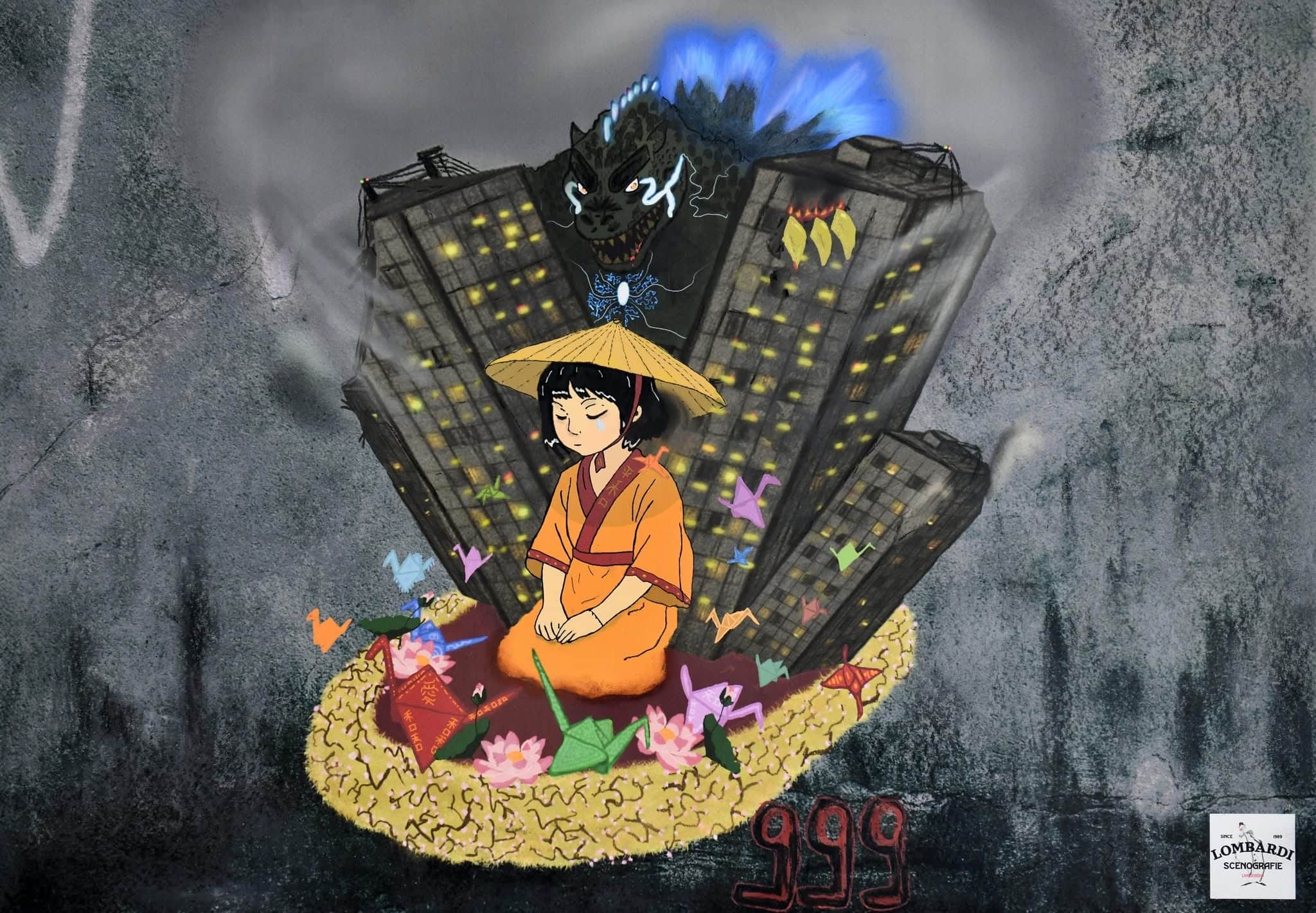 “Secondo una leggenda giapponese, chi piega mille gru di carta può vedere realizzato un desiderio. Sadako Sasaki, vittima delle radiazioni della bomba di Hiroshima, iniziò a piegarle per guarire, ma si fermò a 999. Oggi potrebbe essere a Gaza, a Mariupol, in Sudan. È il volto di ogni bambino che cresce tra sirene e rifugi, che impara troppo presto il linguaggio della guerra. Alle sue spalle incombe Godzilla, simbolo di distruzione. La pace resta incompiuta finché la guerra continuerà a farci ombra”.