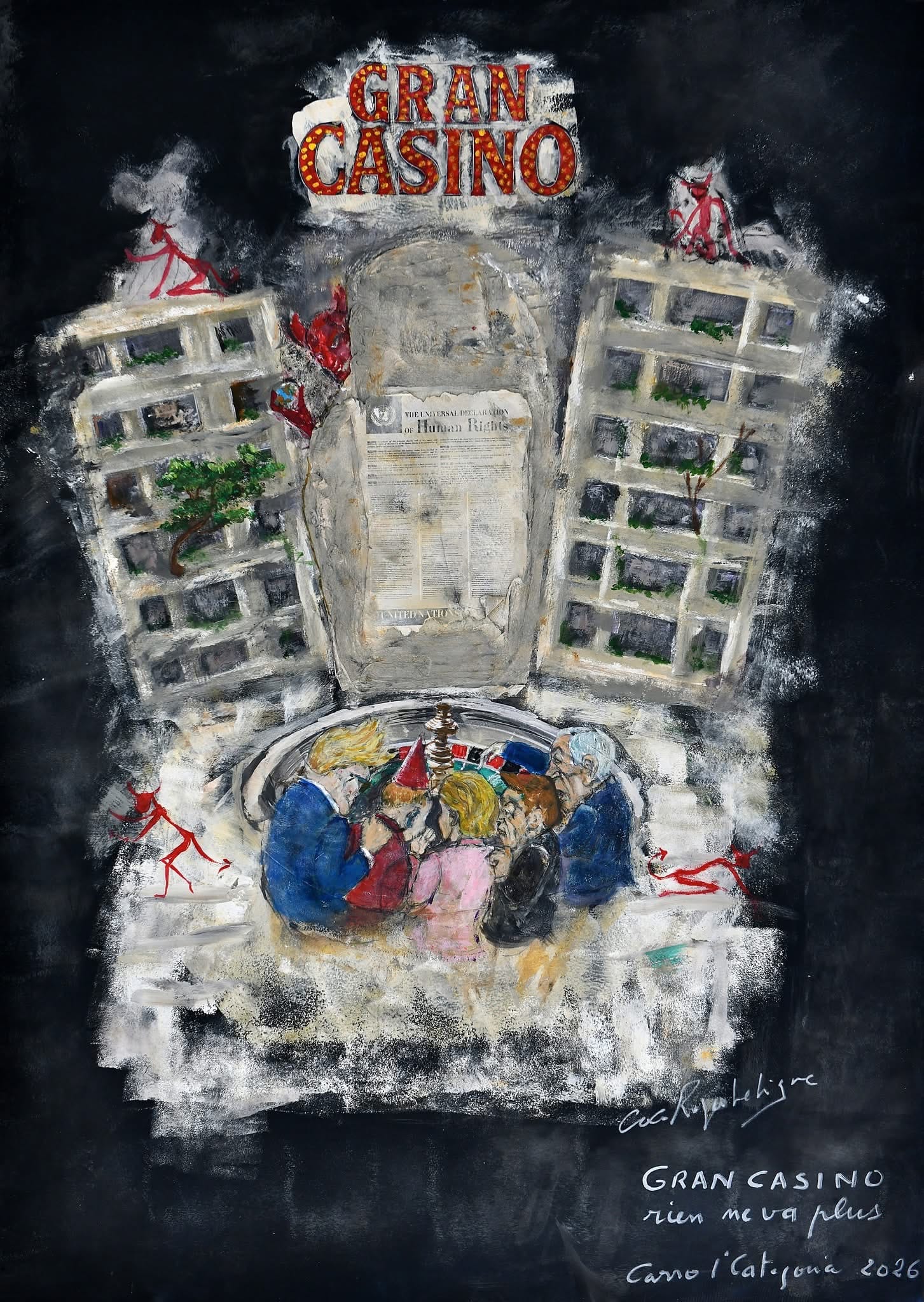 “Tra rovine fumanti e diritti dimenticati, fra echi di notizie e propaganda, alcune figure umane si affacciano sul nulla, voltate di spalle. Poi la scena si apre ed appare la roulette che fa girare il mondo, ormai ridotto a un gran Casino. Seduto su un trono di macerie è il Diavolo in persona a far da croupier. Si gioca alla guerra, si scommette sul caos, si incassa sul disastro. I potenti si sfidano al tavolo del destino, mentre l’umanità è solo una fiche. Benvenuti al Gran Casino. Rien ne va plus”.