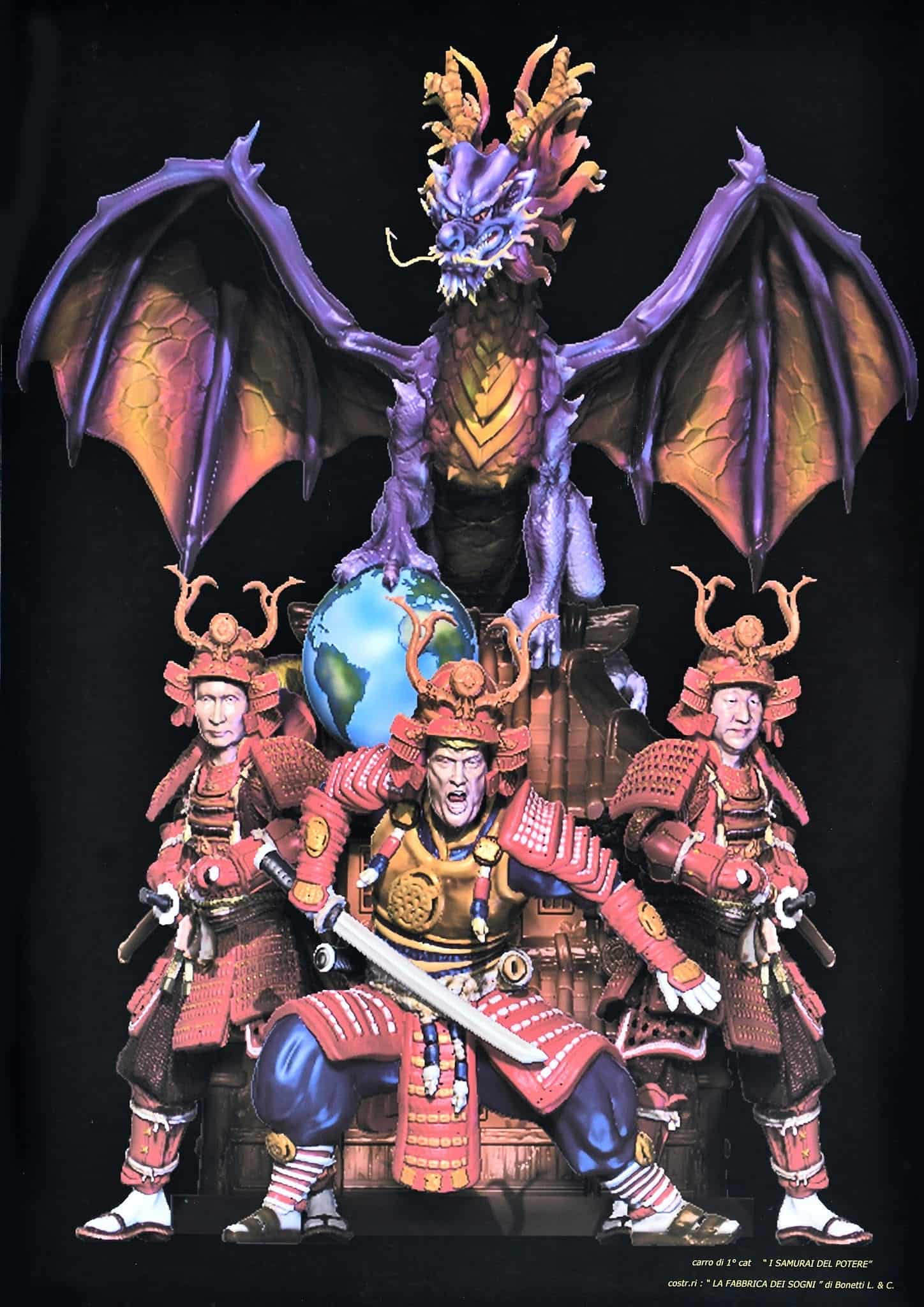 “Nel grande gioco degli equilibri mondiali Trump, Putin e Xi Jinping sono i tre samurai del potere intenti a giocare la propria partita. Putin, silenzioso e calcolatore punta alla restaurazione imperiale della Grande Russia. Xi Jinping composto e disciplinato è icona del potere centralizzato e guida il suo esercito verso la supremazia economica della Cina. Trump è il teatrale e imprevedibile padrone del Caos. Il grande drago che emerge dalla pagoda giapponese è il simbolo dell’antico potere che i tre samurai cercano di dominare o riscrivere”.