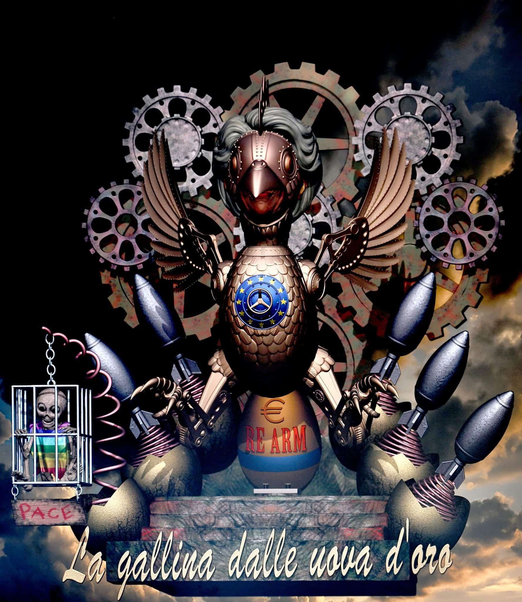 “La finanza ordina, la politica obbedisce: armi a debito. Con il re-arm, la presidente dell’Unione europea Ursula von der Leyen lancia la militarizzazione dell’economia. Dal sogno di pace e sostenibilità del Green Deal si passa al grido “armatevi e partite”. Ma a pagare – osserva il costruttore – è sempre il popolo bue. La gigantesca gallina robotica al centro della scena cela la caricatura grottesca della presidente. Le sue uova non generano vita, ma strumenti di morte, come bombe e proiettili. E la pace, rinchiusa in gabbia, guarda impotente il mondo che cambia”.