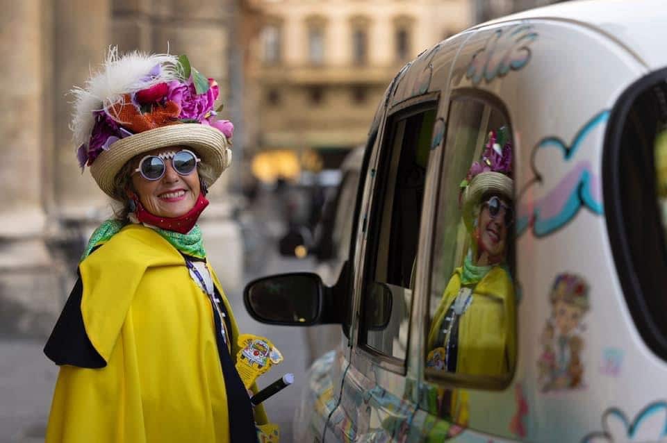 Caterina Bellandi è una tassista di Firenze, conosciuta per i suoi cappelli e mantelli colorati e per il suo taxi ancora più appariscente, pieno di fiori, giochi e caramelle. Un paradiso per i bambini a cui lei presta particolare attenzione, soprattutto i piccoli malati che accompagna sempre in ospedale.Il mio variopinto taxi per me è cuore pulsante, è una navicella spaziale con cui mi dirigo nell’universo degli incontri e delle relazioni, con cui trasporto i miei supereroi alle terapie ed in coinvolgenti avventure”. “La comunità lavorativa a cui appartengo, ovvero quella dei taxisti, mi sottopone ad un quotidiano esercizio di ascolto. La mia immagine, talvolta giudicata stravagante, oltre che il periodo che stiamo vivendo di forte stress anche in ambito lavorativo, mi sottopone spesso a situazioni di non accoglienza. Praticare gentilezza in tale ambito dipende molto dagli stimoli: con persone gentili lo sforzo è inesistente, mentre davanti a stimoli di rifiuto o rigidità, mi esercito al silenzio con l’intento di trovare un modo per entrare in relazione anche con chi, ha più difficoltà a praticare la gentilezza”
